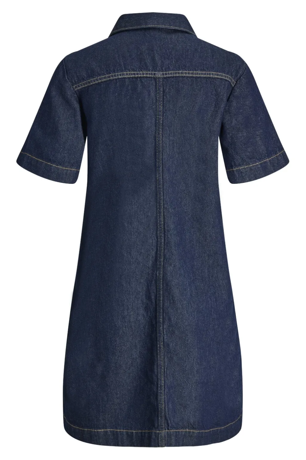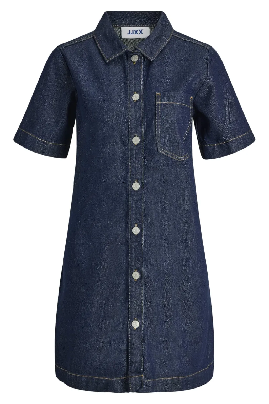 Mørkeblå denimkjole fra Jjxx med skjortekrave og brystlomme. Den har knapper hele vejen ned og korte ærmer.