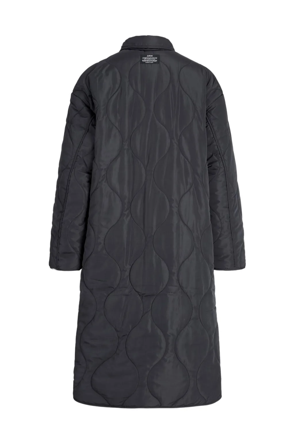 Sort quiltet frakke fra Jjxx med lang pasform og synlige syninger. Frakken har en krave, to forlommer og en skjult lynlås i siden.