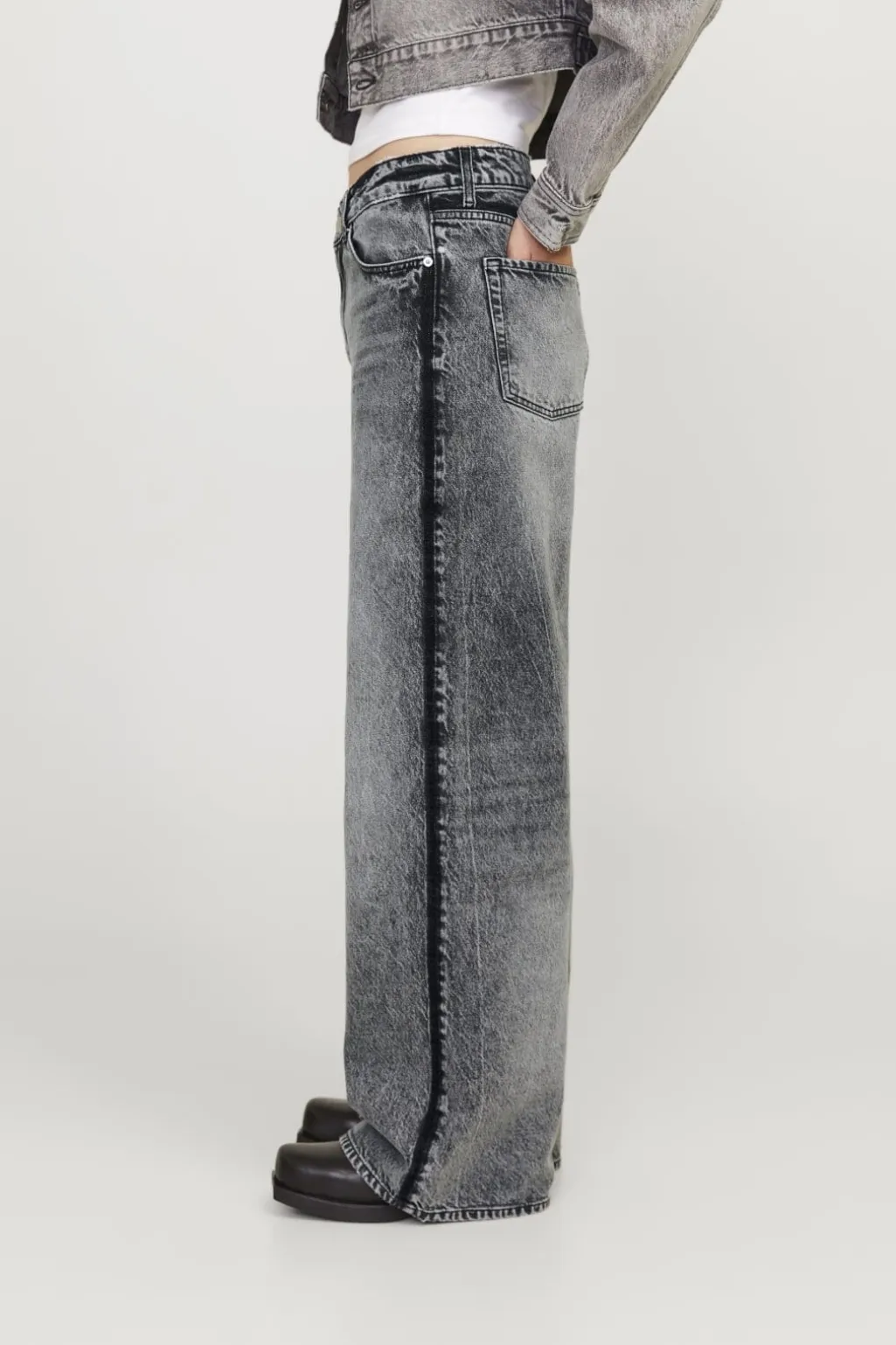 Grå stonewashed jeans fra Jjxx med høj talje og bredt ben. Bukserne har et slidt denim-look med dekorative syninger og praktiske lommer både foran og bagpå.