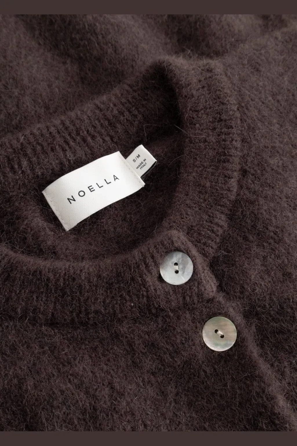 Strikket cardigan fra Noella i chokoladebrun. Den har en løs pasform med rund hals, knapper foran og voluminøse ærmer. Perledetaljer giver cardiganen et diskret pift.