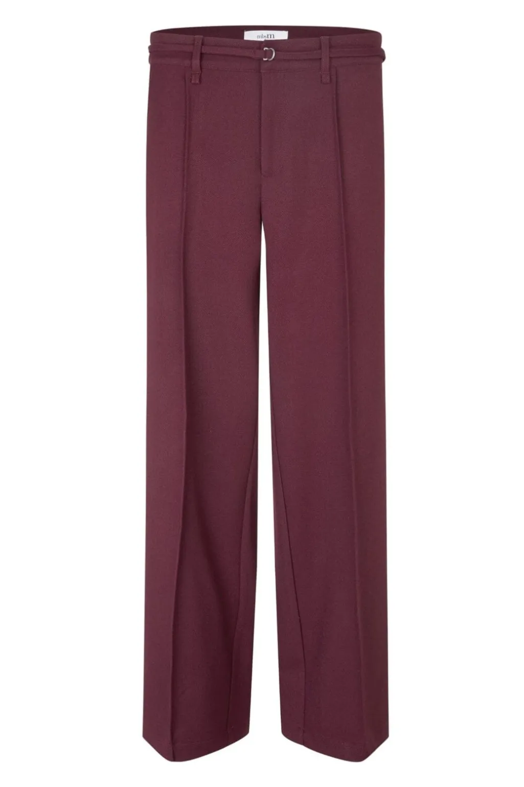 Bukser fra MbyM i en dyb lilla-rød farve. Bukserne har et klassisk snit med bæltestropper og synlige syninger på forsiden.