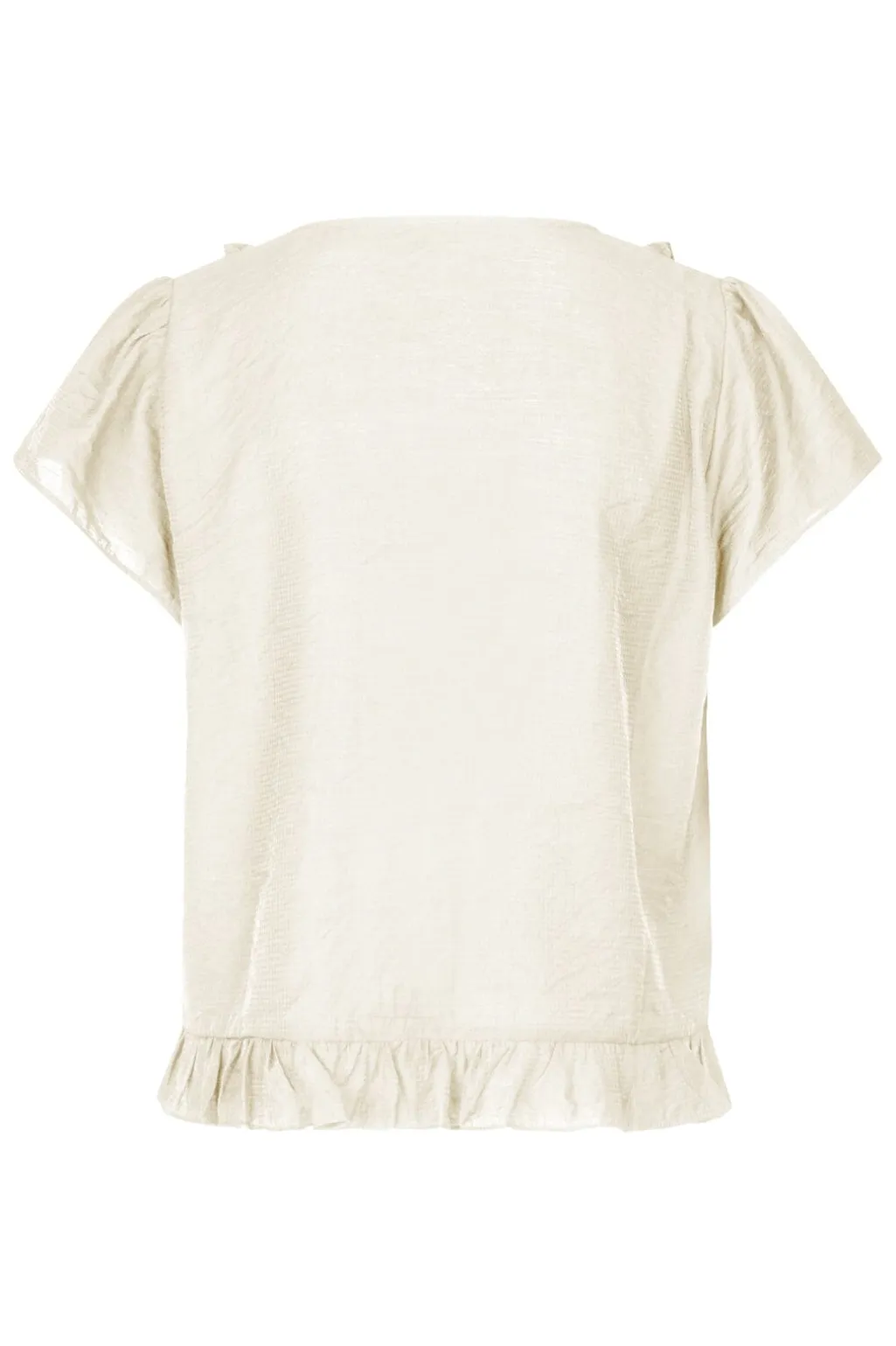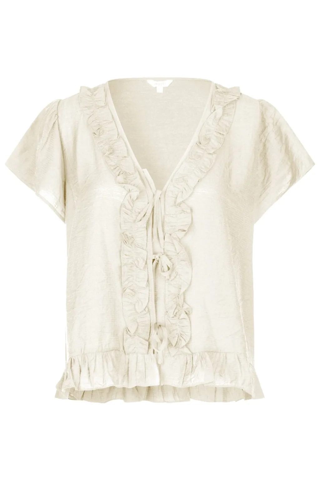 Lys bluse fra MbyM med korte ærmer og V-halsudskæring. Blusen har rynkede flæsekanter langs udskæringen og bindebånd foran. Den lyse Sugar-farve passer til mange outfits.