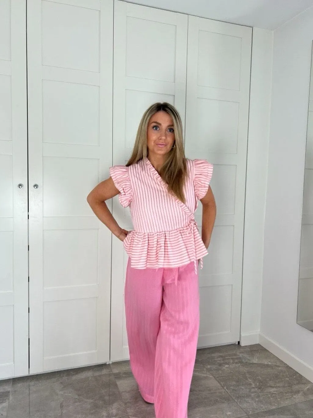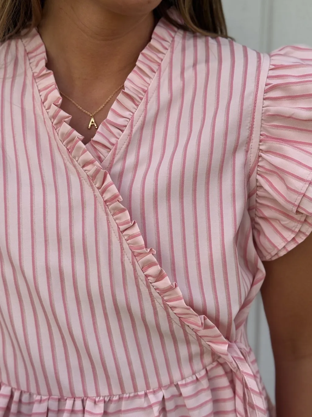 Pink peplum-top fra Dear Molly med hvide striber. Toppen har flæseærmer, V-udskæring og snøredetaljer. Den er syet med peplum-effekt i taljen og har et romantisk design.