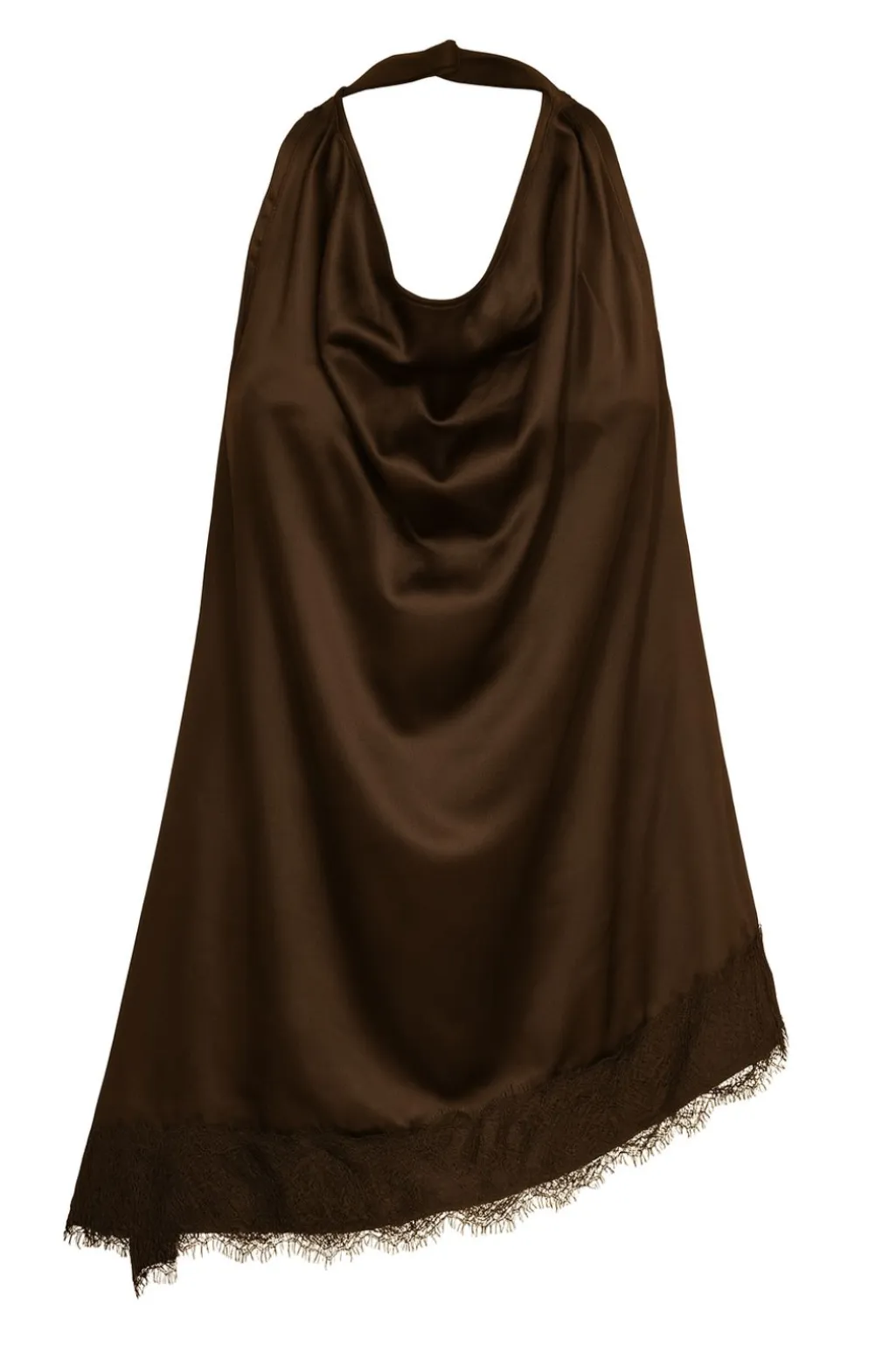 Mørkebrun top fra A-View med draperet halsudskæring og halterneck-stil. Toppen har en åben ryg og blondekant ved sømmen, som giver et blødt fald.