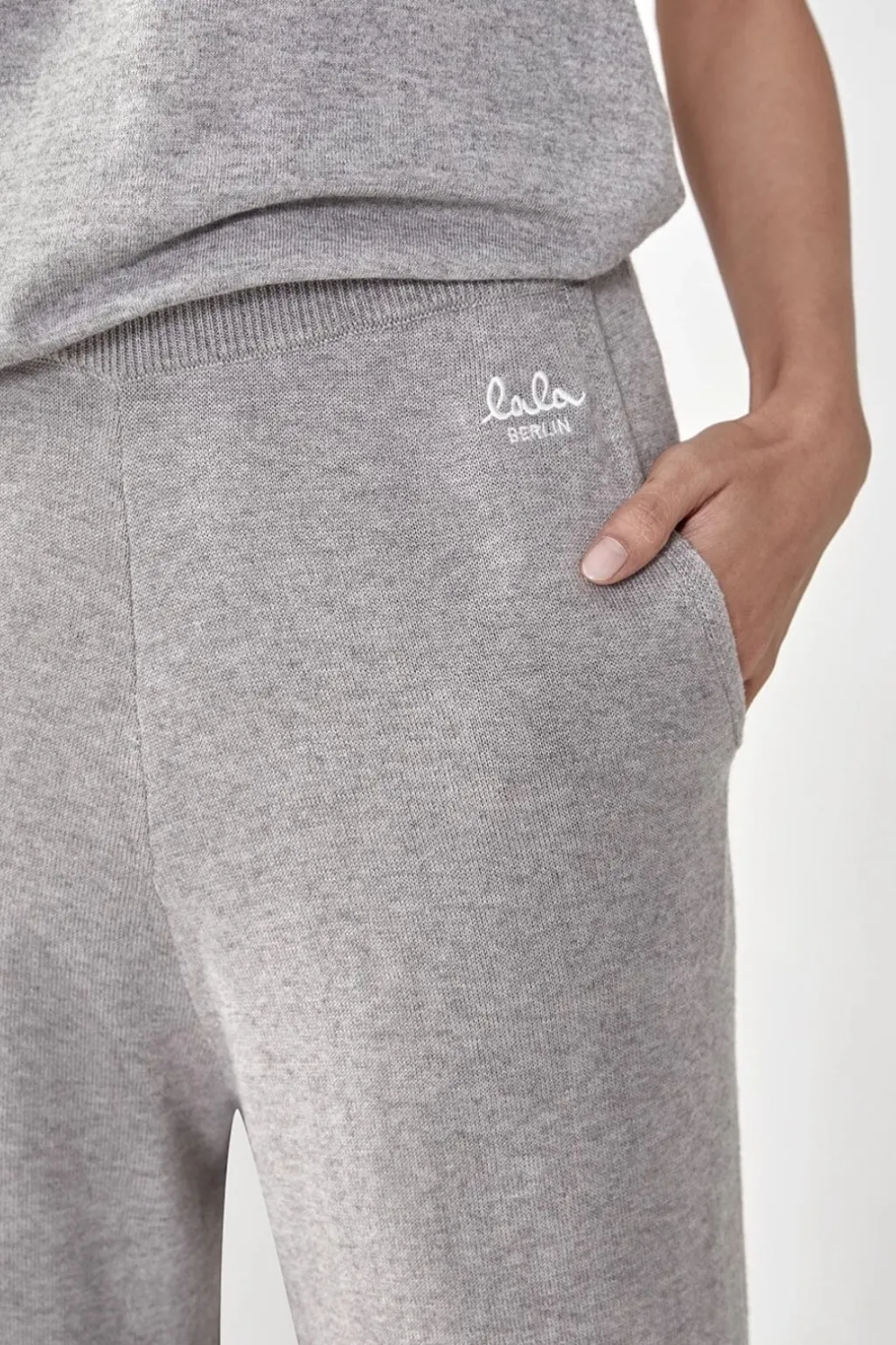 Grå strikbukser fra Lala Berlin i blødt bomuld og uld. Bukserne har en løs pasform med høj talje og går til midt på læggen. De har sidelommer og et broderet logo på taljen.