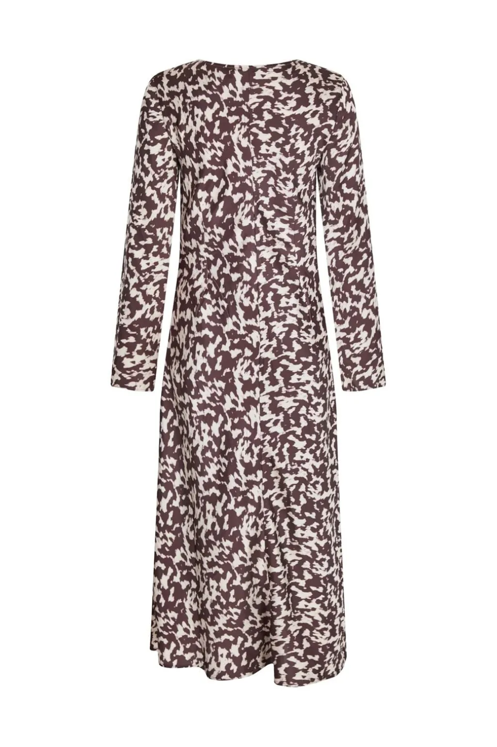 Kjole fra Neo Noir i chokoladebrun med hvidt grafisk mønster. Den har en dyb V-udskæring med bindebånd og lange ærmer med flagrende design. Kjolen når til midt på læggen.