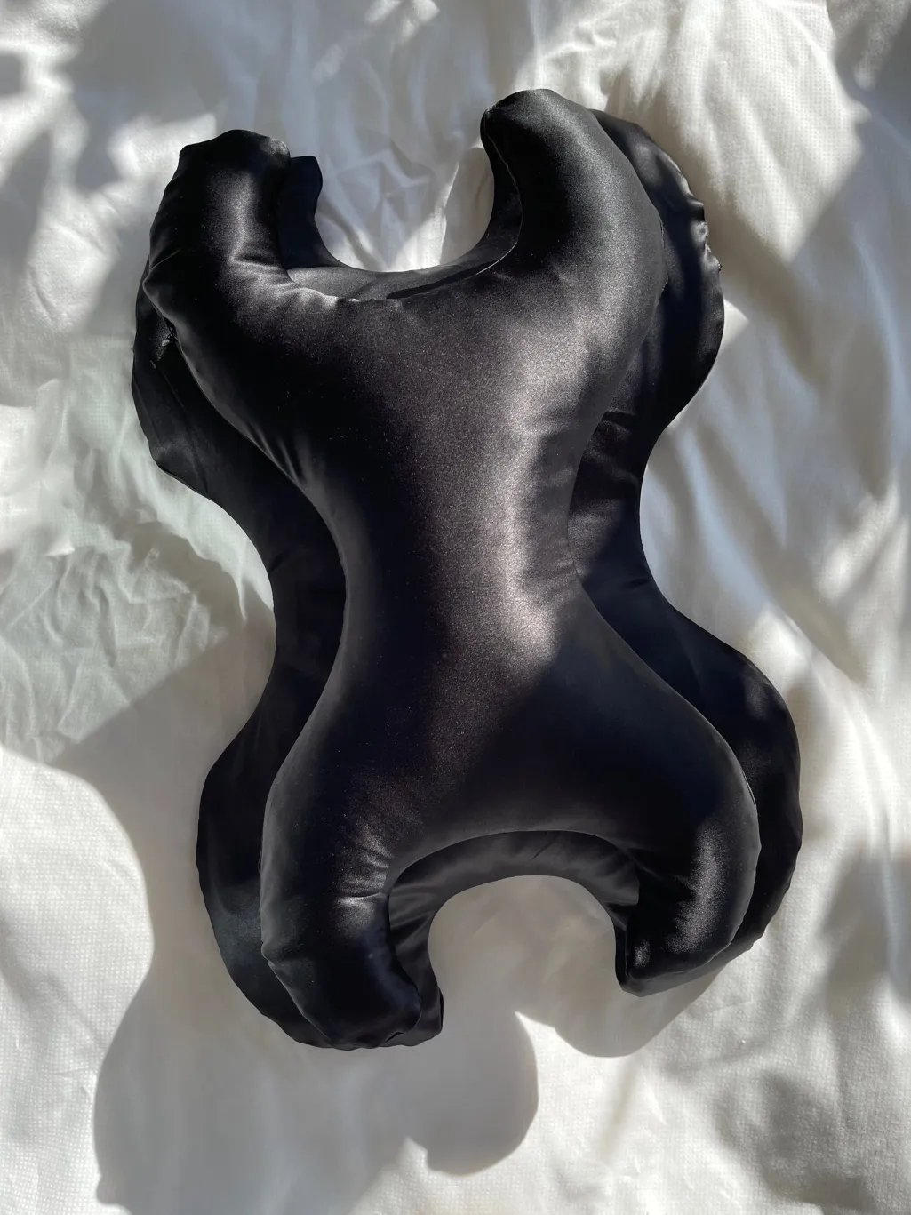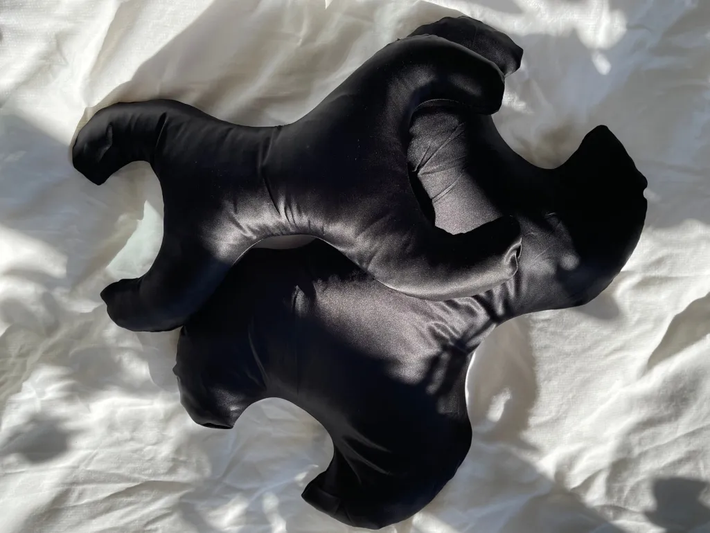 Sort pude fra Save My Face med silkebetræk. Puden har en særlig form og er fyldt med syntetiske fibre, der er modstandsdygtige over for bakterier.