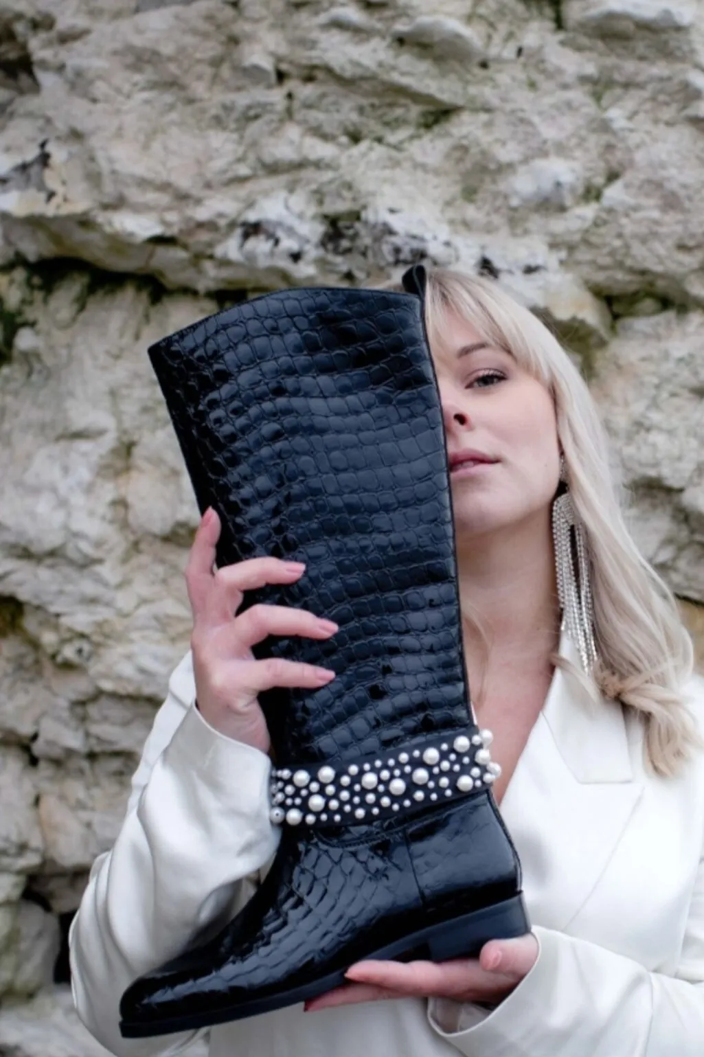 Sorte støvler fra Copenhagen Shoes med blankt krokodillemønster i læder. Støvlen har en mandelformet tå og et aftageligt bånd med hvide perler omkring anklen.