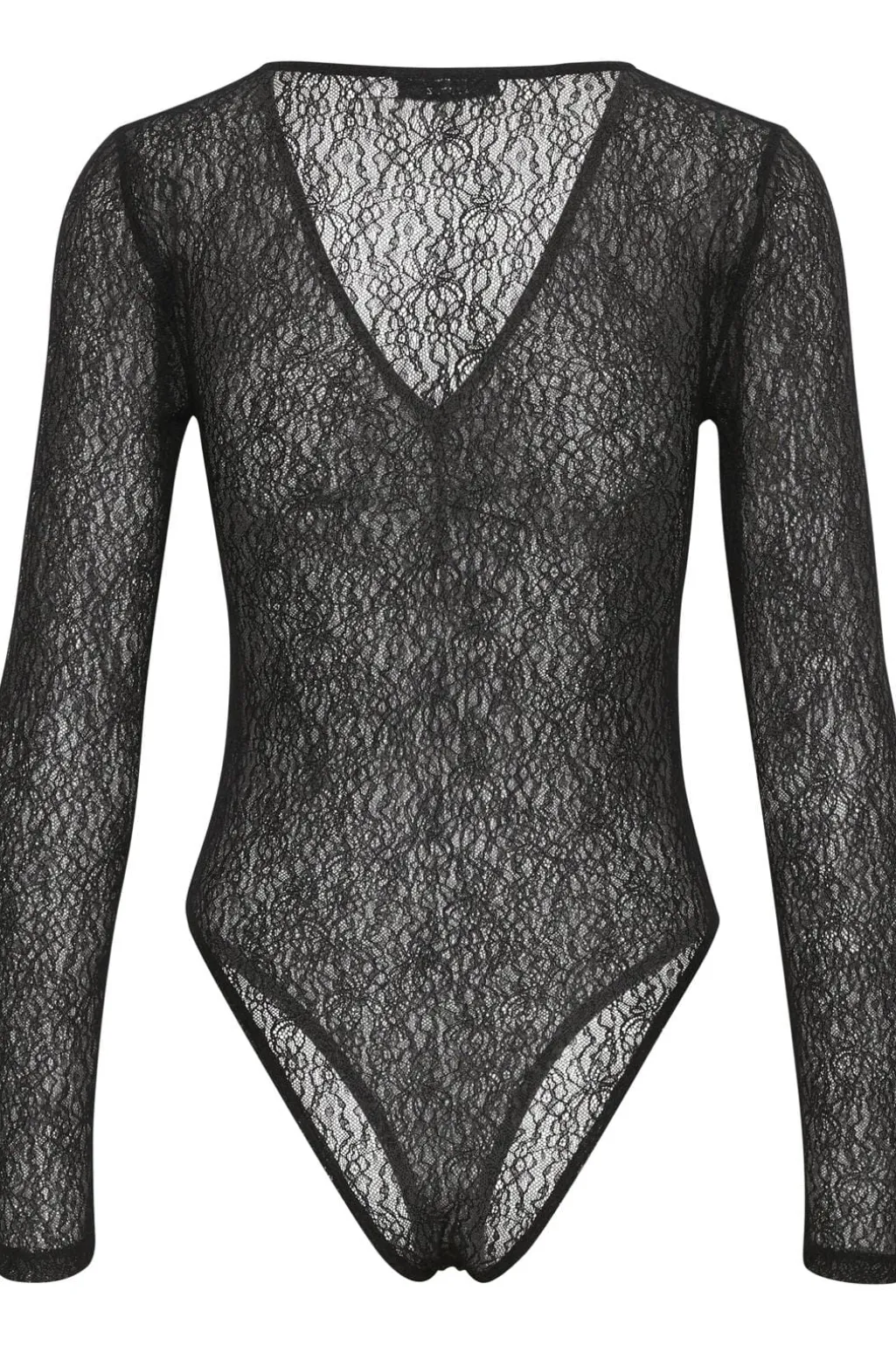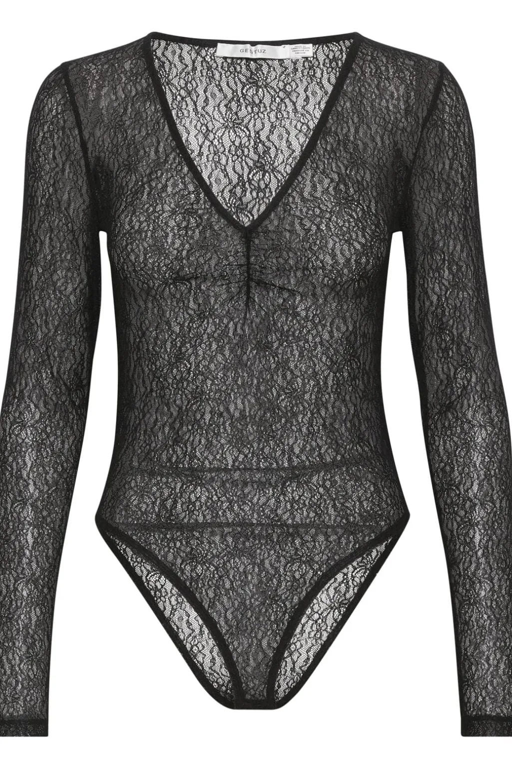 Sort body fra Gestuz i gennemsigtig blonde. Den har en V-udskæring og lange ærmer. Blondemønstret giver bodyen et feminint udtryk med en thong-bund.