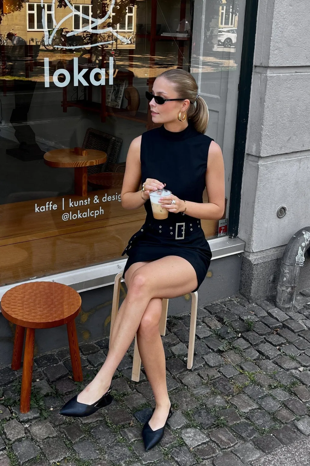 Sort kjole fra Noella med ærmeløst design og høj hals. Kjolen har et medfølgende bælte med stort firkantet spænde.