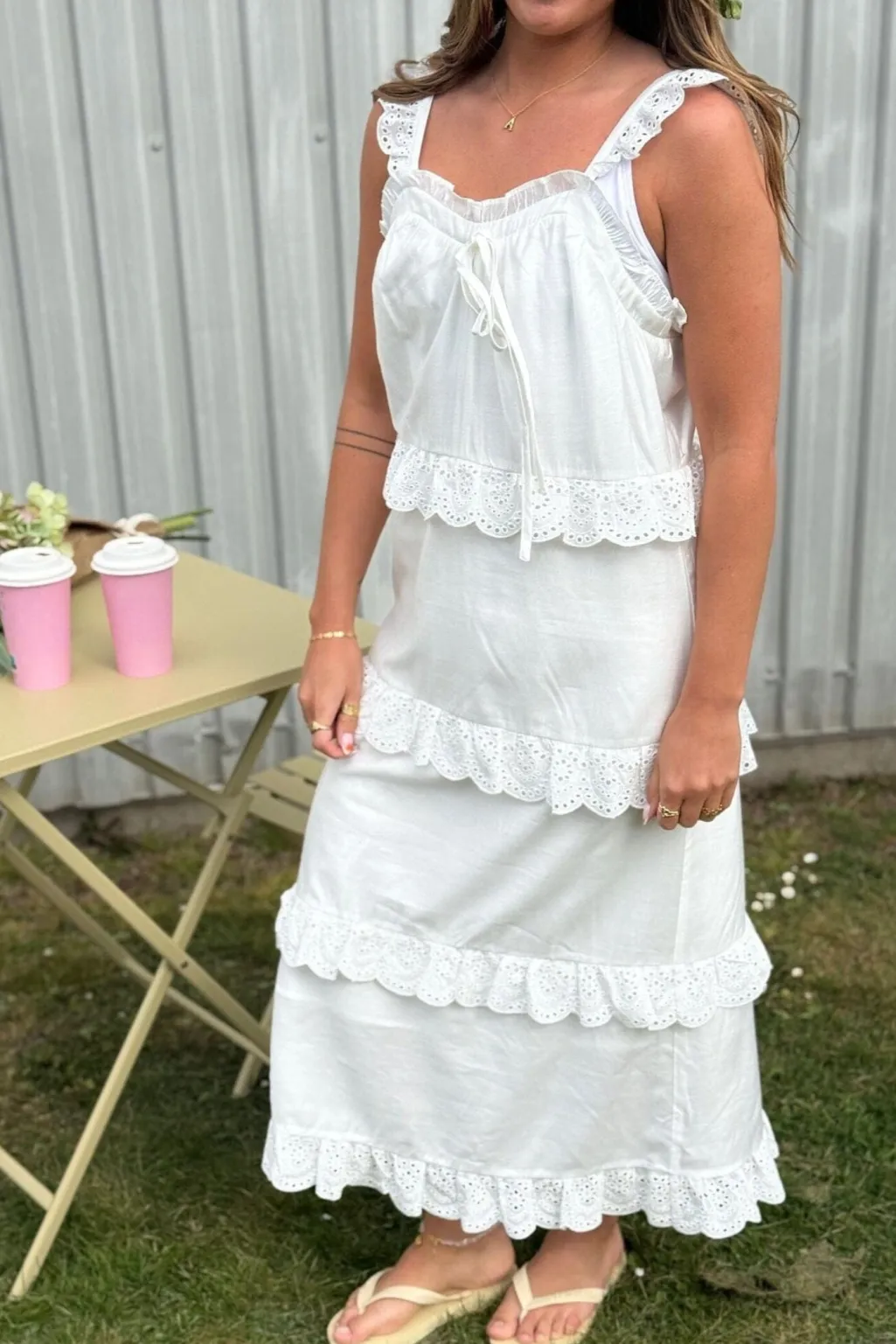 Hvid kjole fra Dear Molly med blondekanter og lag-på-lag-design. Kjolen har stropper og en blød pasform med fire vandrette blondelag fra taljen og ned.