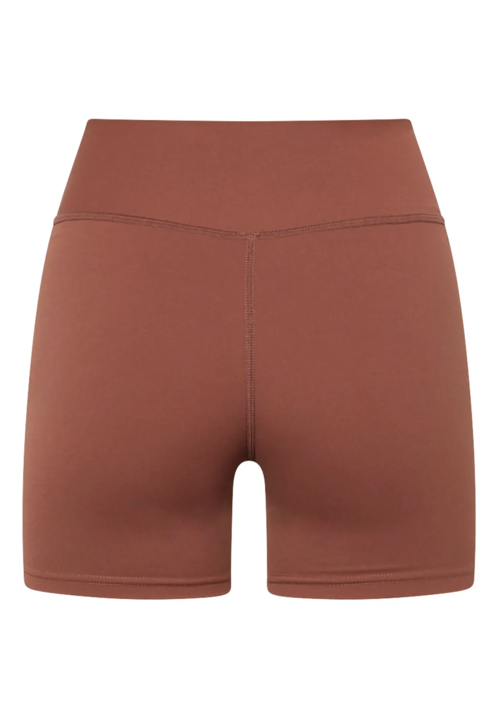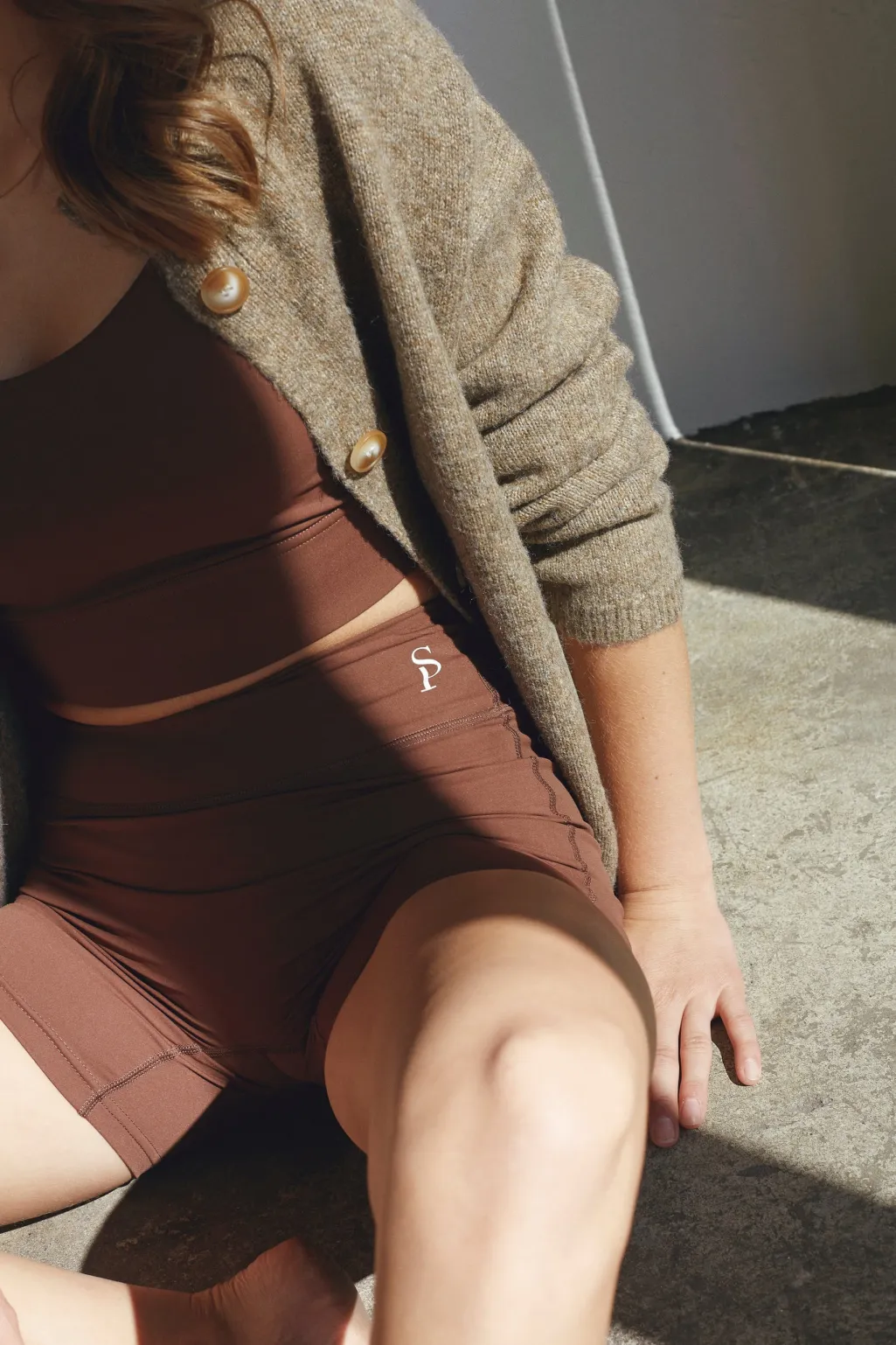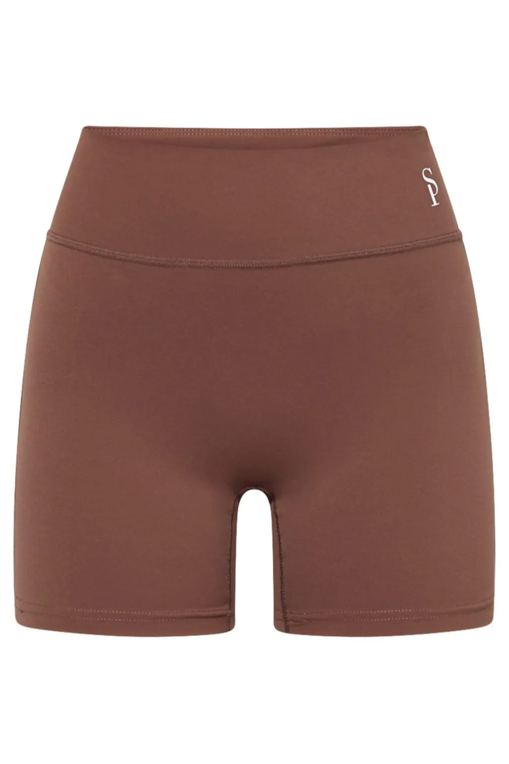 Brune shorts fra Sisters Point, lavet af 60 % nylon og 40 % elastan. Shortsene har en høj talje og en tætsiddende pasform med logo-print på siden.