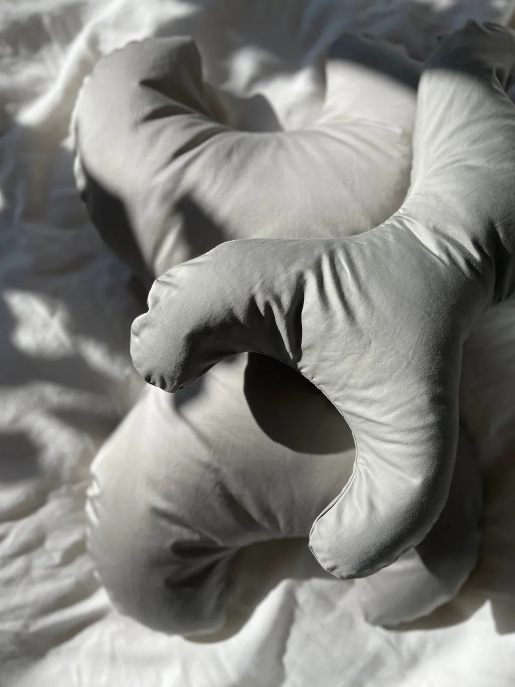 Grå pude med patenteret timeglasform fra Save My Face. Den specielle udformning holder ansigtet frit under søvn, og det aftagelige betræk gør den nem at holde ren.