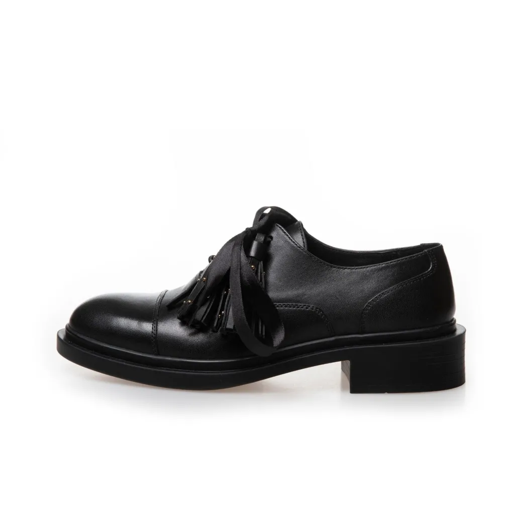 Sorte sko fra Copenhagen Shoes med frynser og satinsnørebånd. Skoene har en rund tå og en lav blokhæl, der giver god støtte til foden.