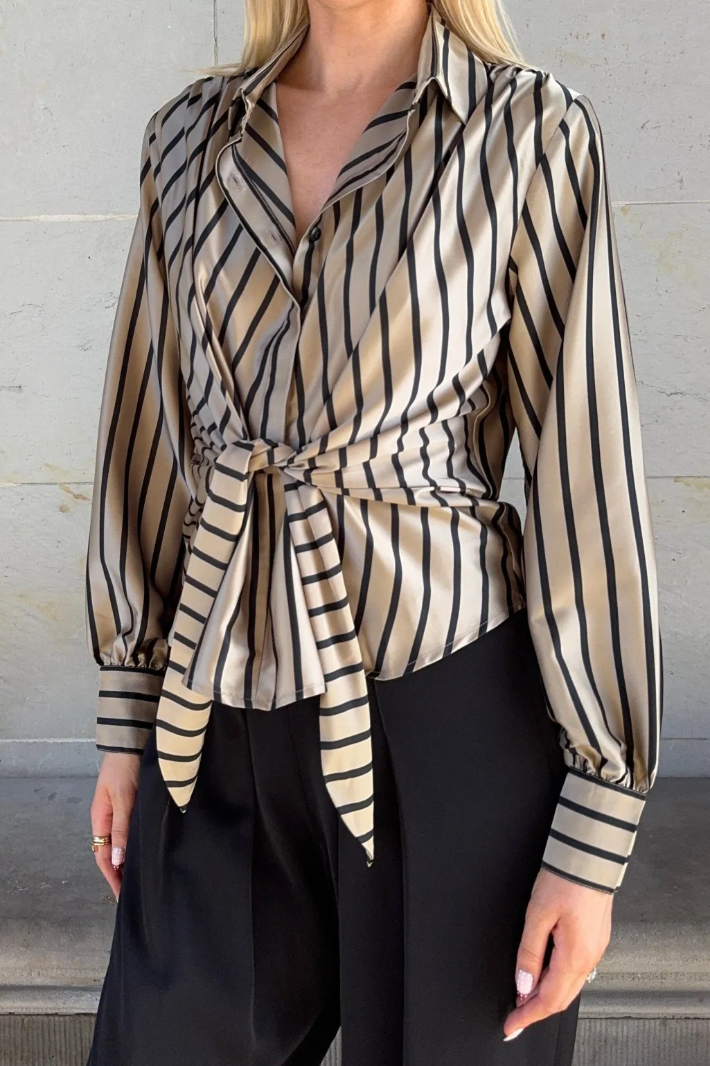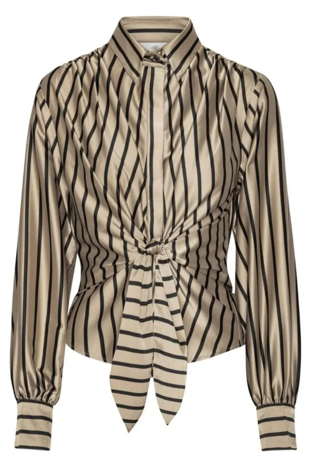 Stribet skjorte fra Karmamia i beige og sort. Skjorten har en slim fit-pasform med skjortekrave og lange ærmer. Bindebånd i taljen og flæsedetaljer giver skjorten et unikt præg.