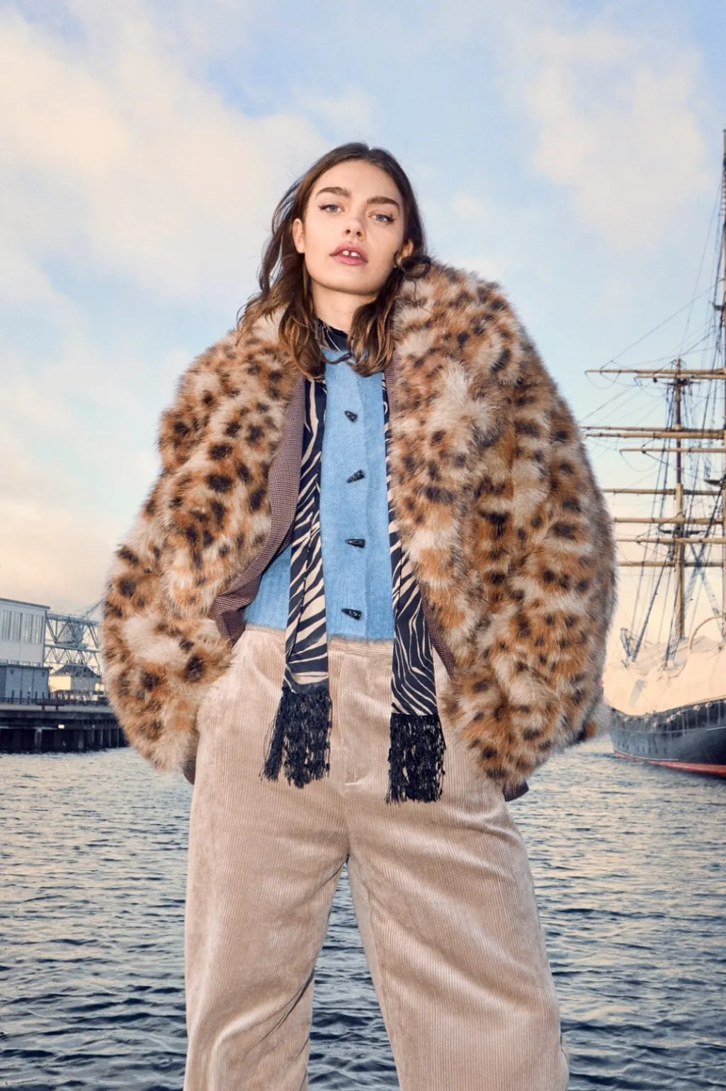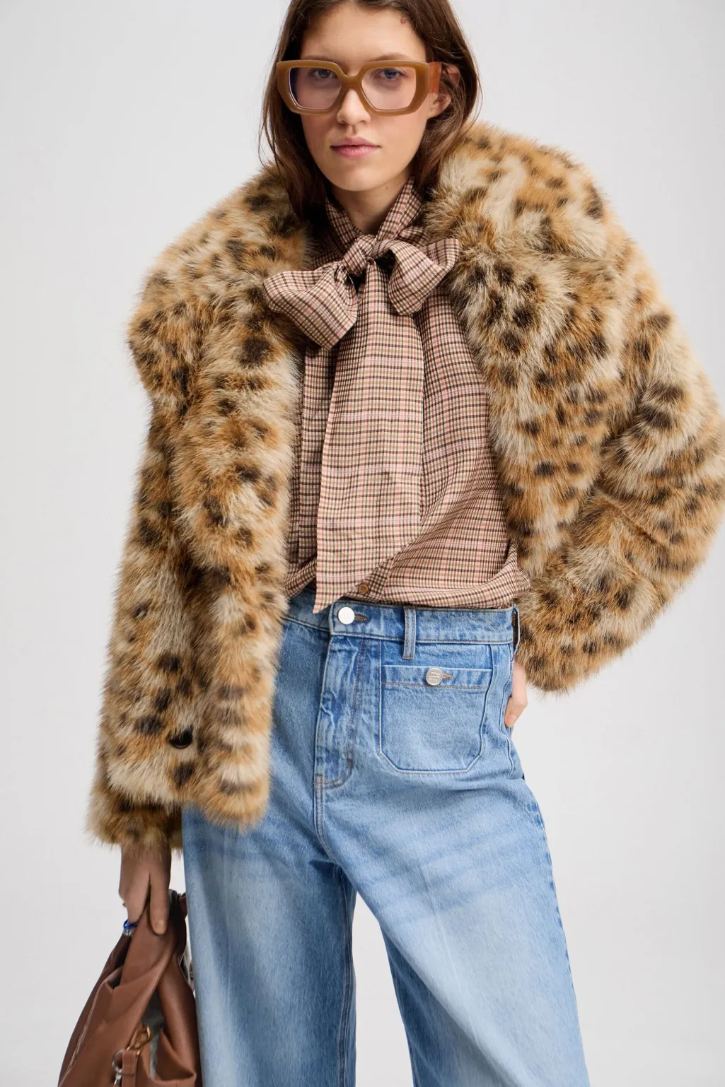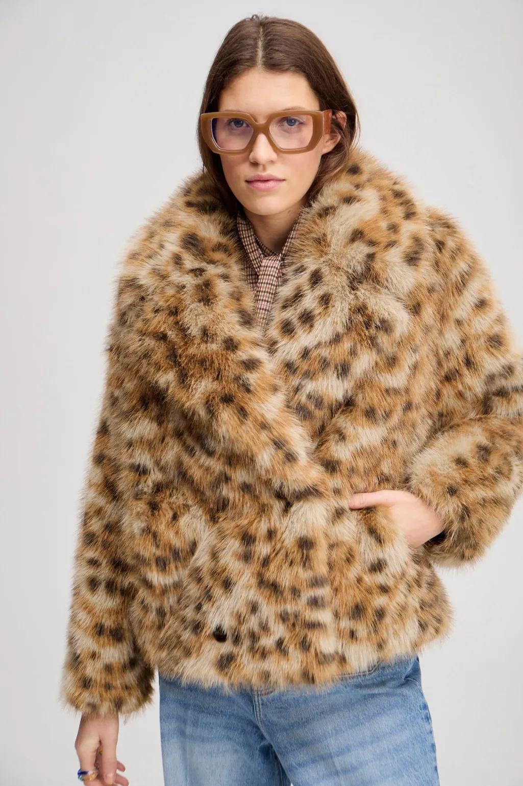 Faux fur-jakke i camel med brunt og sort dyreprint. Den dobbeltradede knaplukning og brede krave giver jakken et klassisk udtryk, mens sidelommerne tilføjer praktisk funktionalitet.