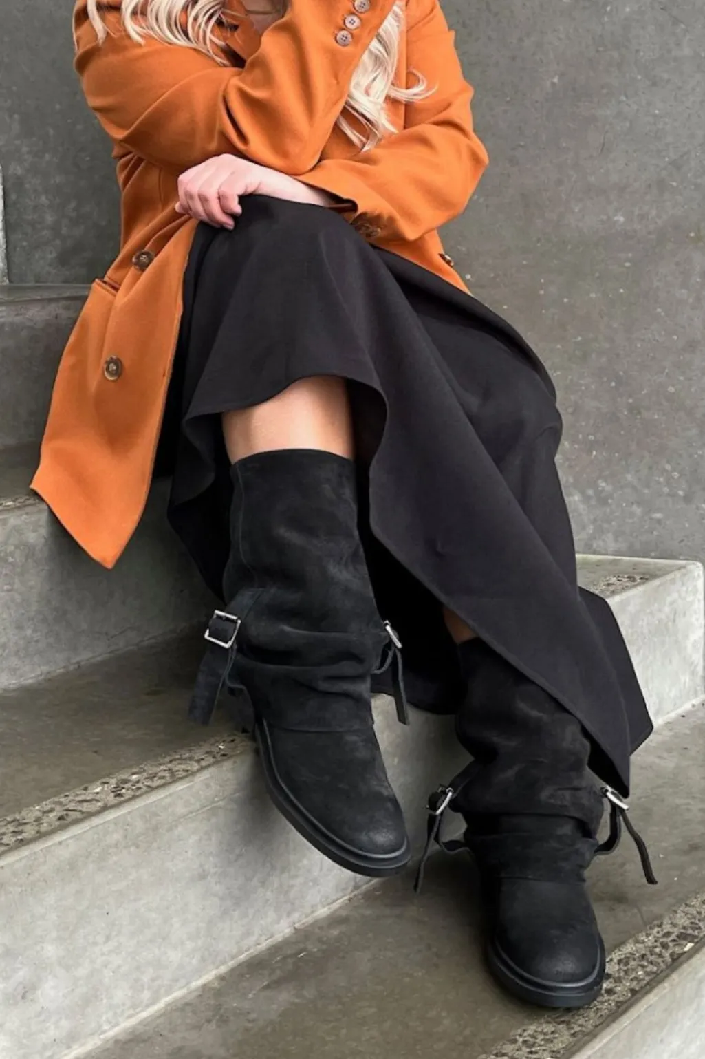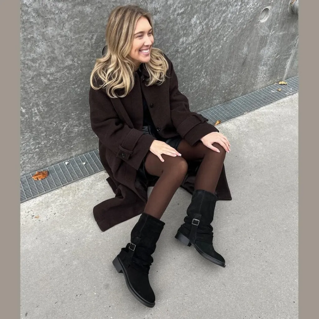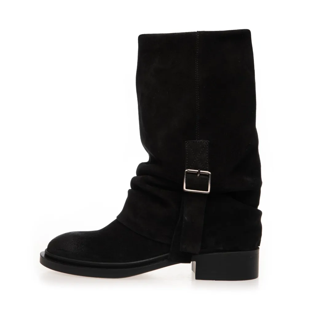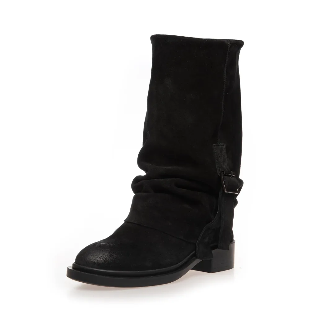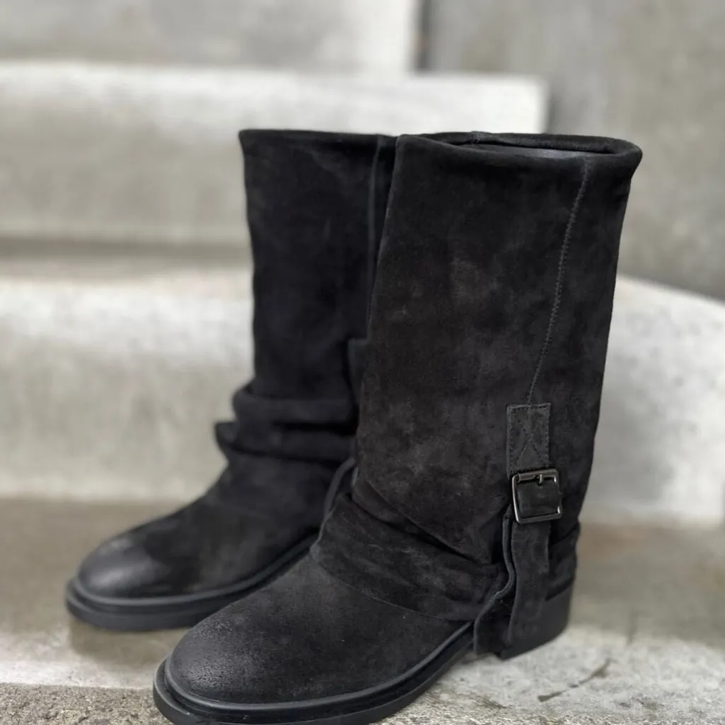 En rå og karakterfuld støvle med blød og børstet overflade i brushed suede. Det løse skaft og det brede spænde giver støvlen et afslappet og cool look, som passer perfekt til både hverdag og weekend.