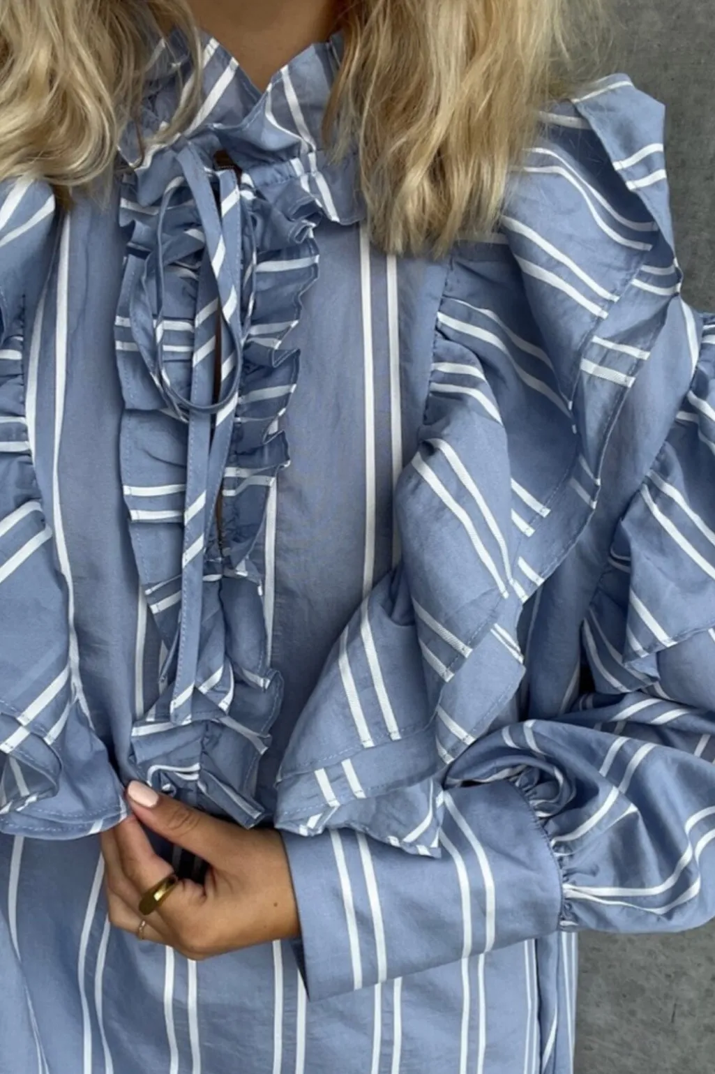 Blå og hvidstribet kjole fra Stories From The Atelier by Copenhagen Shoes. Den har høj hals med flæser og lange ærmer med flæsemanchetter.