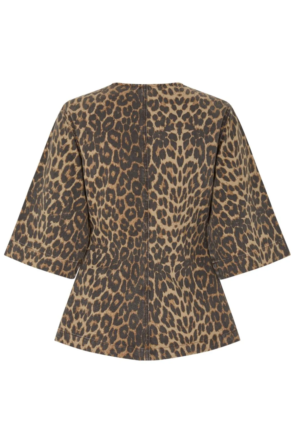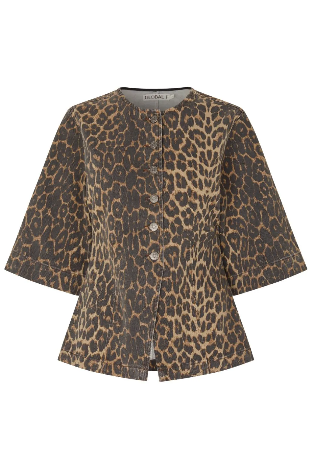 Bomuldsjakke fra Global Funk med leopardmønster i beige og brune nuancer. Jakken har knapper foran, rund hals og 3/4-ærmer med en let peplum-silhuet.