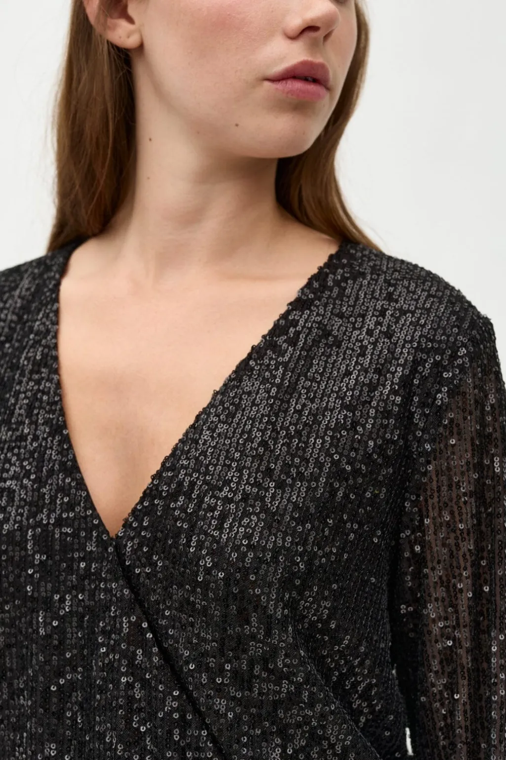 Sort festbluse fra MbyM med palietter over det hele. Blusen har en V-halsudskæring og lange ærmer, der giver den et festligt udtryk til særlige anledninger.