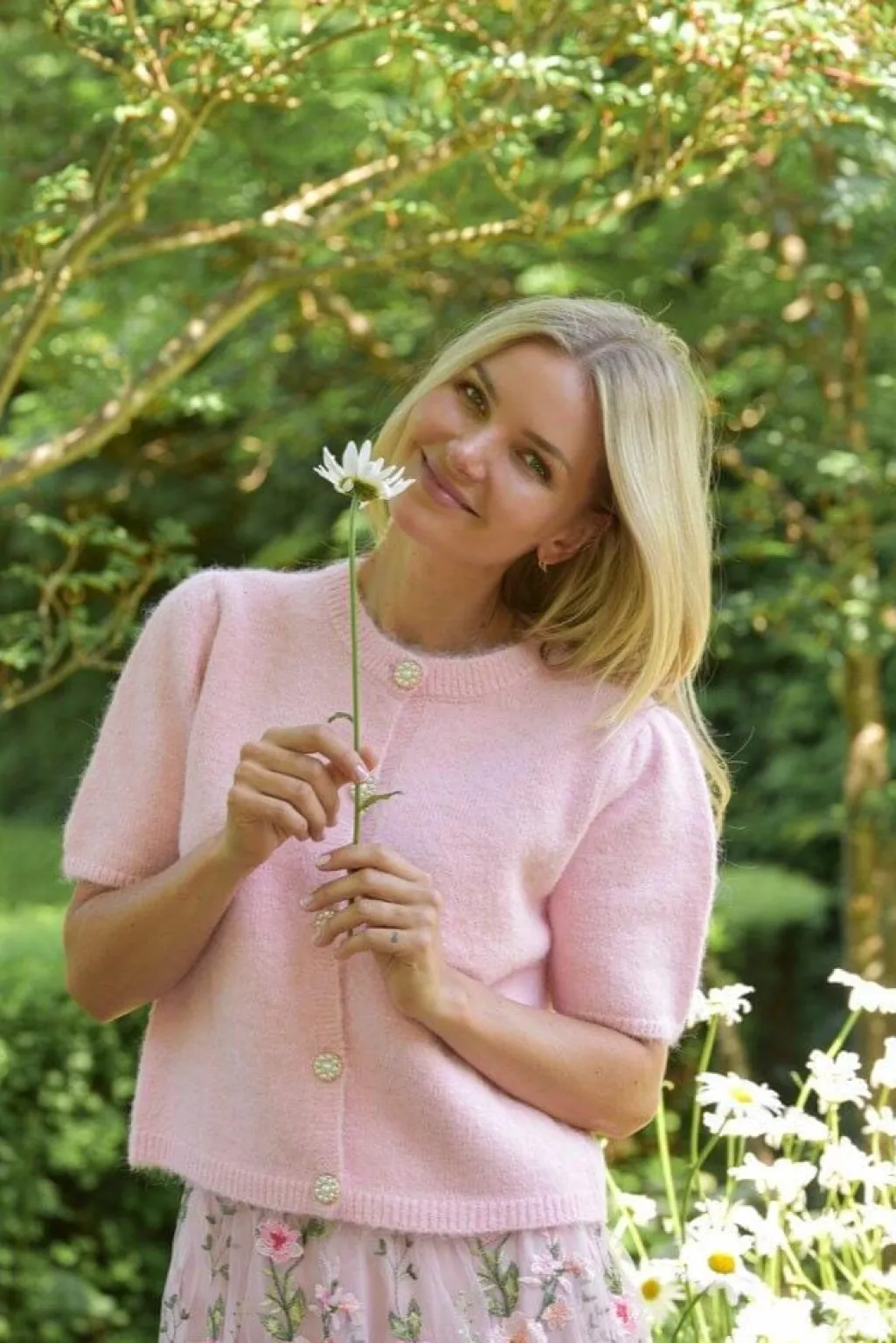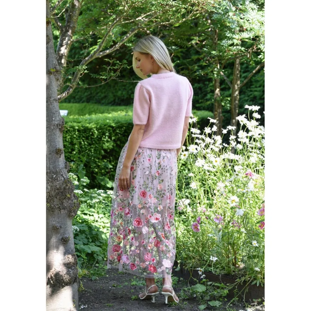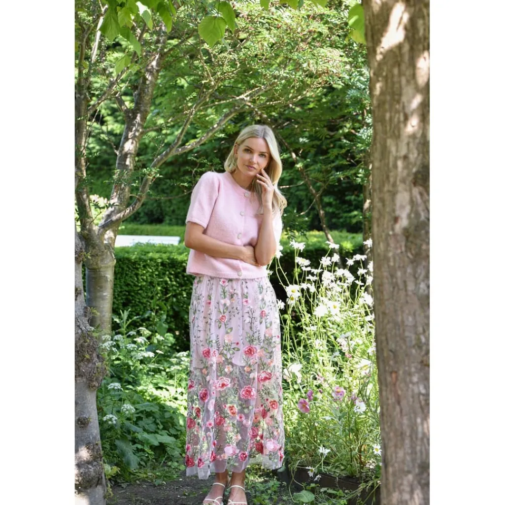 Strikket cardigan fra A-View i en rosanuance. Cardiganen har korte ærmer og perledetaljer på knapperne.