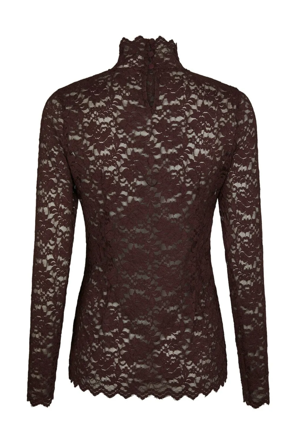 Bordeauxfarvet blondebluse fra Neo Noir med høj hals og bølget kant. Blusen har en figursyet pasform og er lavet af strækbart blondemateriale med blomstermønster.