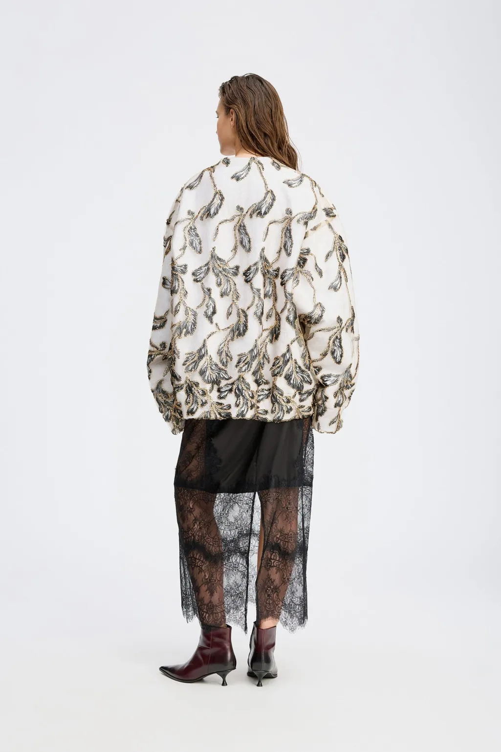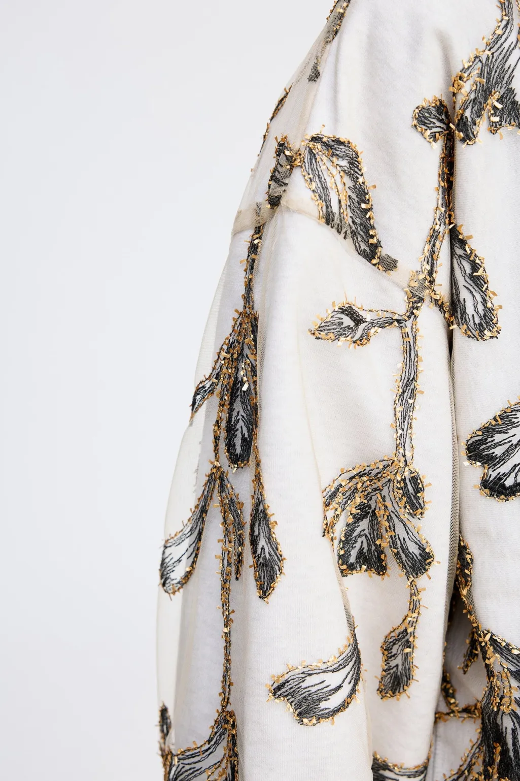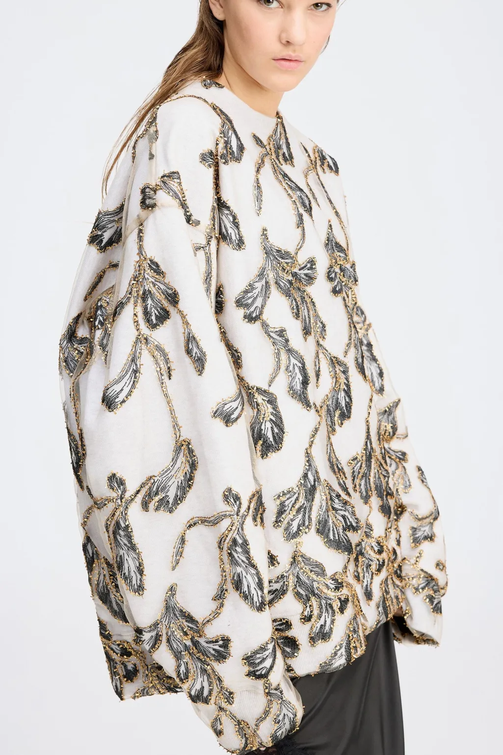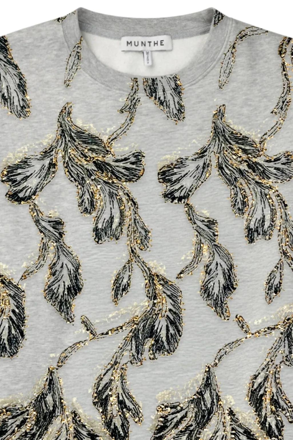 Sweatshirt fra Munthe med broderet bladmønster i guld og sort. Den løse model har rund hals og lange ærmer med pailletter og broderi som dekorative elementer.