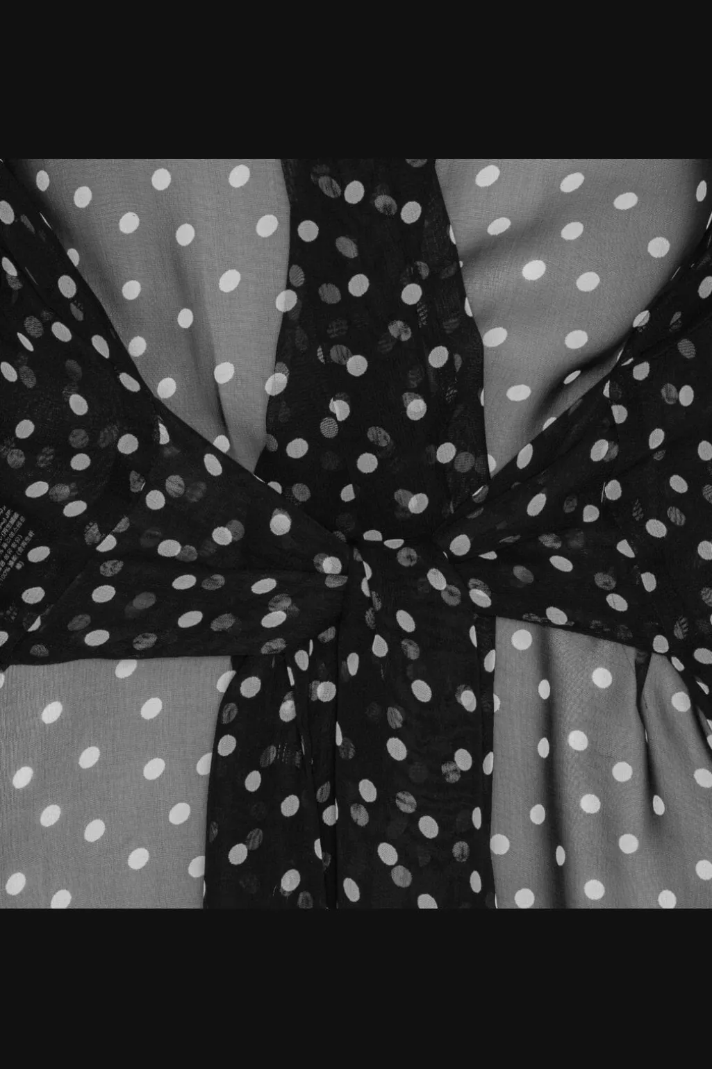 Sort slå-om-bluse fra Karmamia i let mesh med hvide prikker. Blusen har V-udskæring, lange ærmer med manchetter og bindebånd i taljen til justering af pasformen.