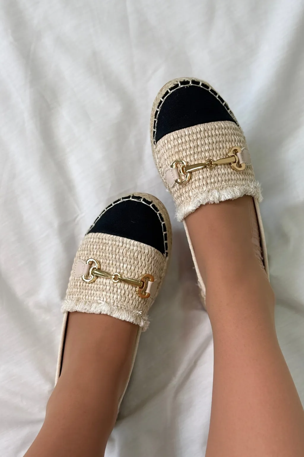Beige sandal fra Bloom med vævet design og sort tåkappe. Den dekorative metaldetalje på forsiden kombinerer det rustikke og det fine i ét design.