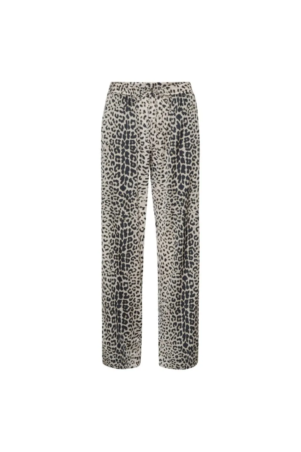 Bukser fra Karmamia med beige leopardmønster. De har en løs pasform med gulvlængde og snørelukning i taljen. Bukserne er lavet af blødt polyester med en behagelig følelse mod huden.