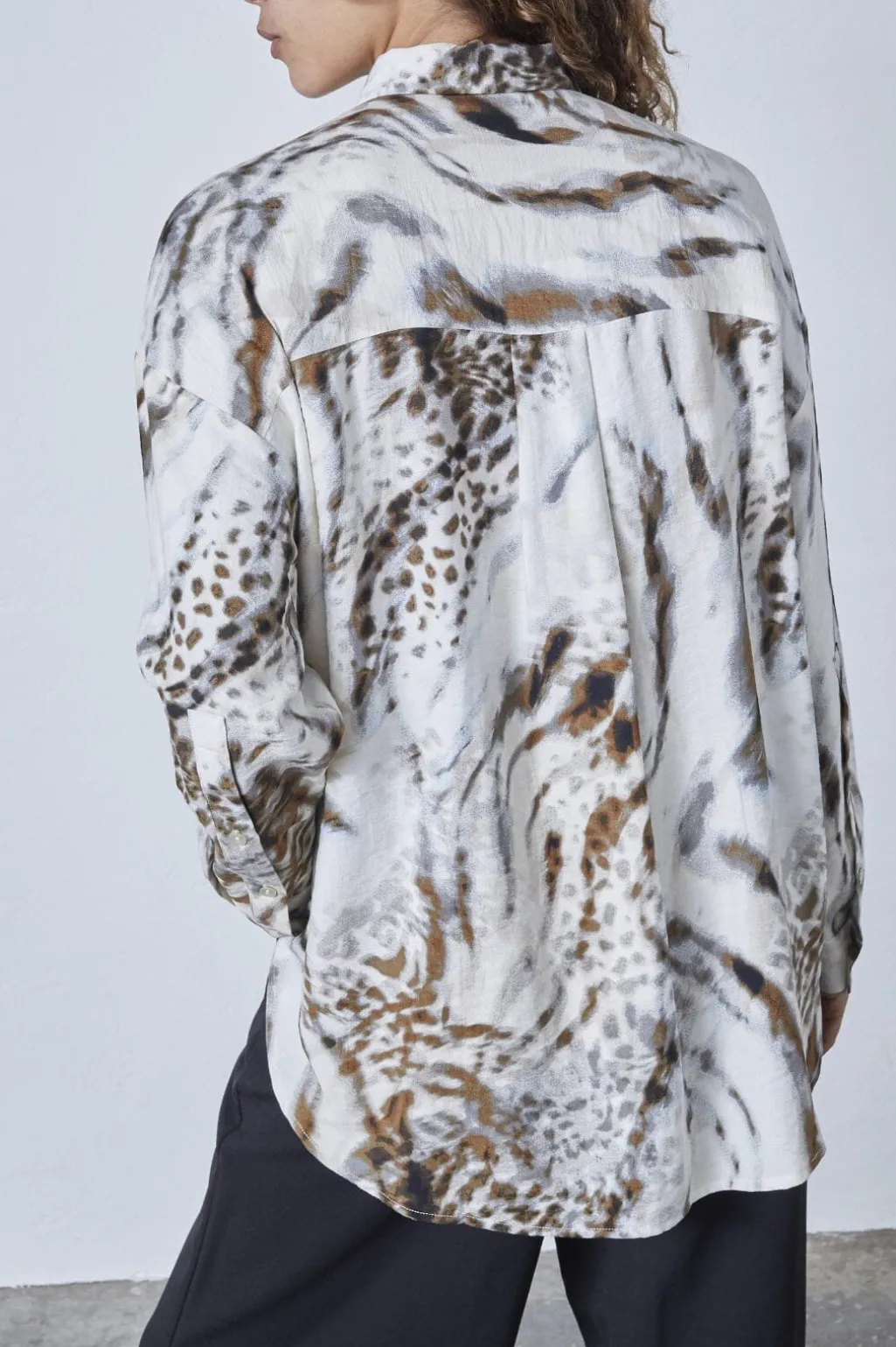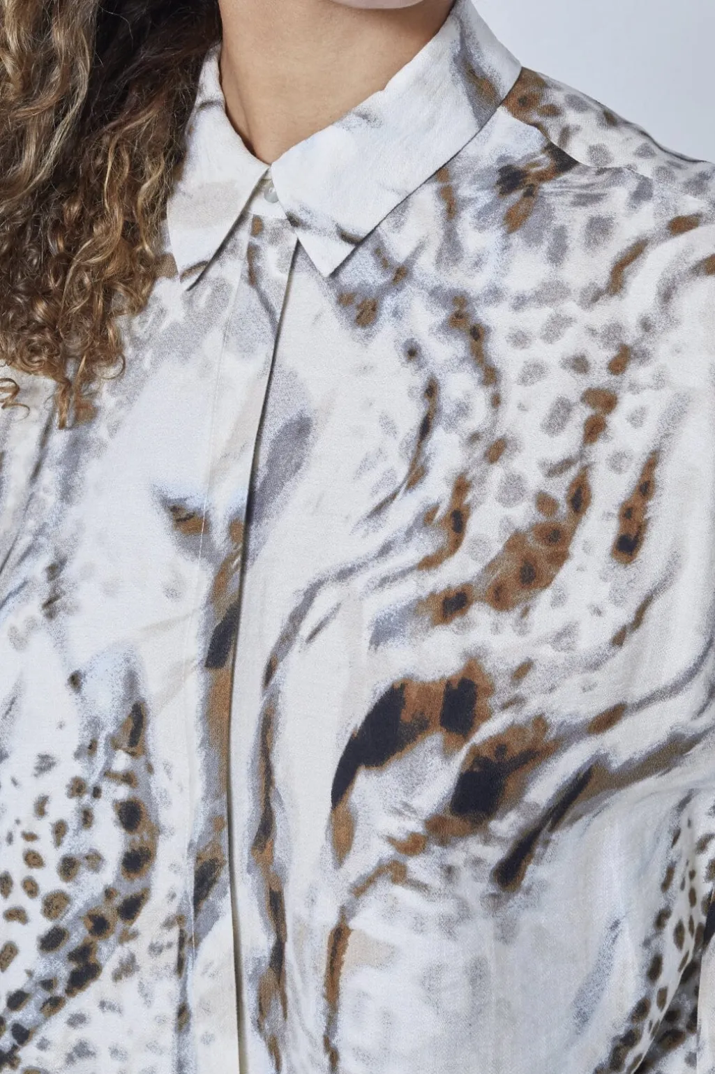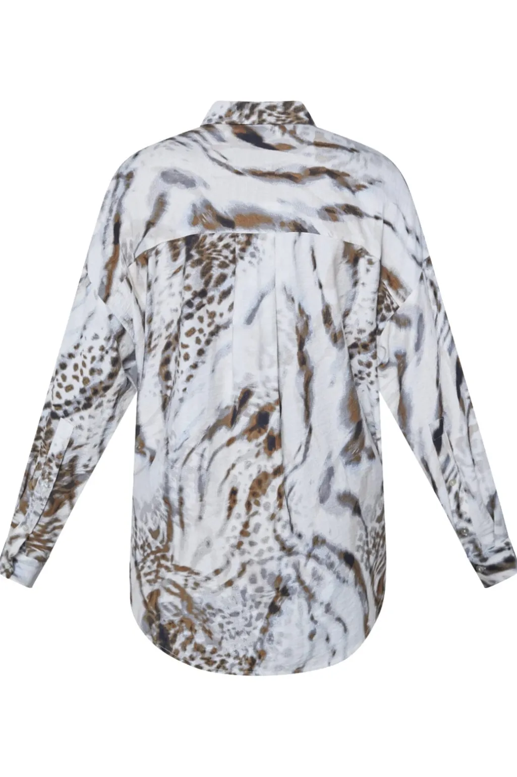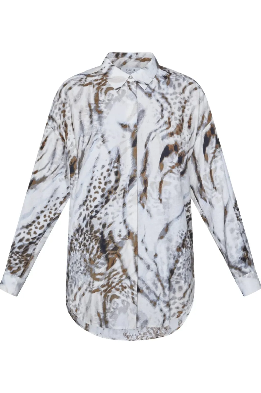 Skjorte fra Love & Divine i creme og brun med dyreprint. Skjorten har en klassisk krave og lange ærmer med manchetter.