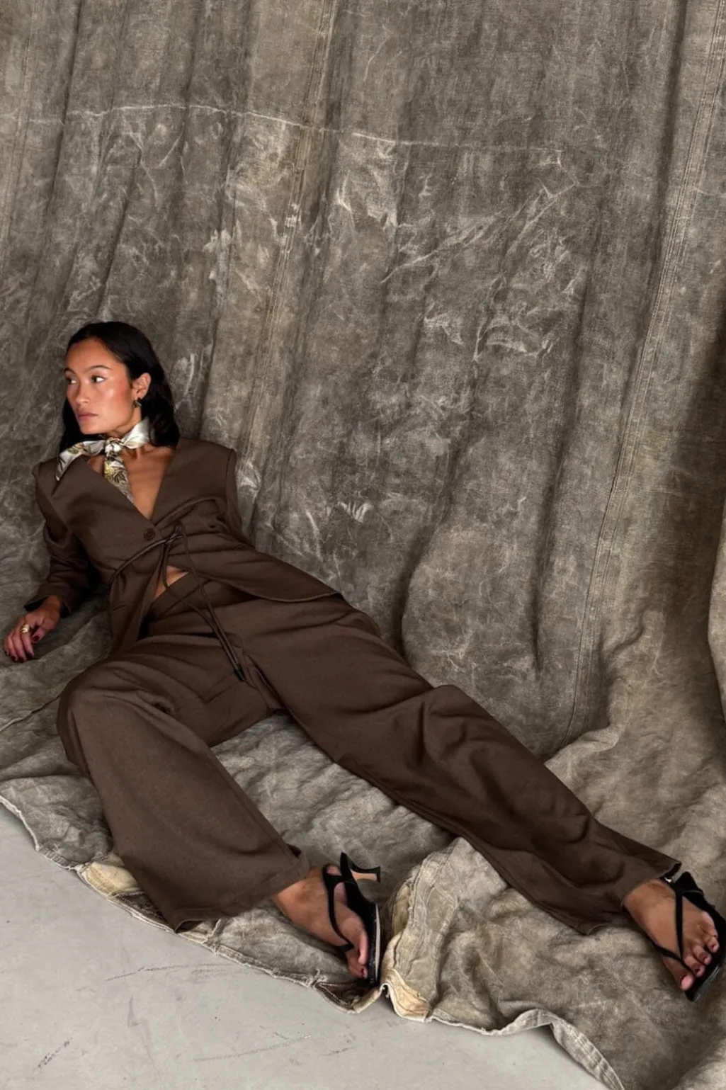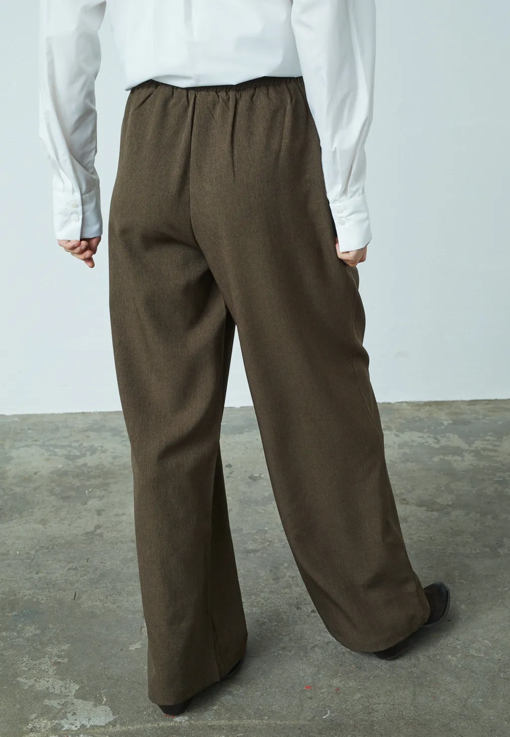 Brune bukser fra Love & Divine i meleret stof med høj talje og løs pasform. Bukserne har lange ben og en elastisk talje, der giver god bevægelighed.