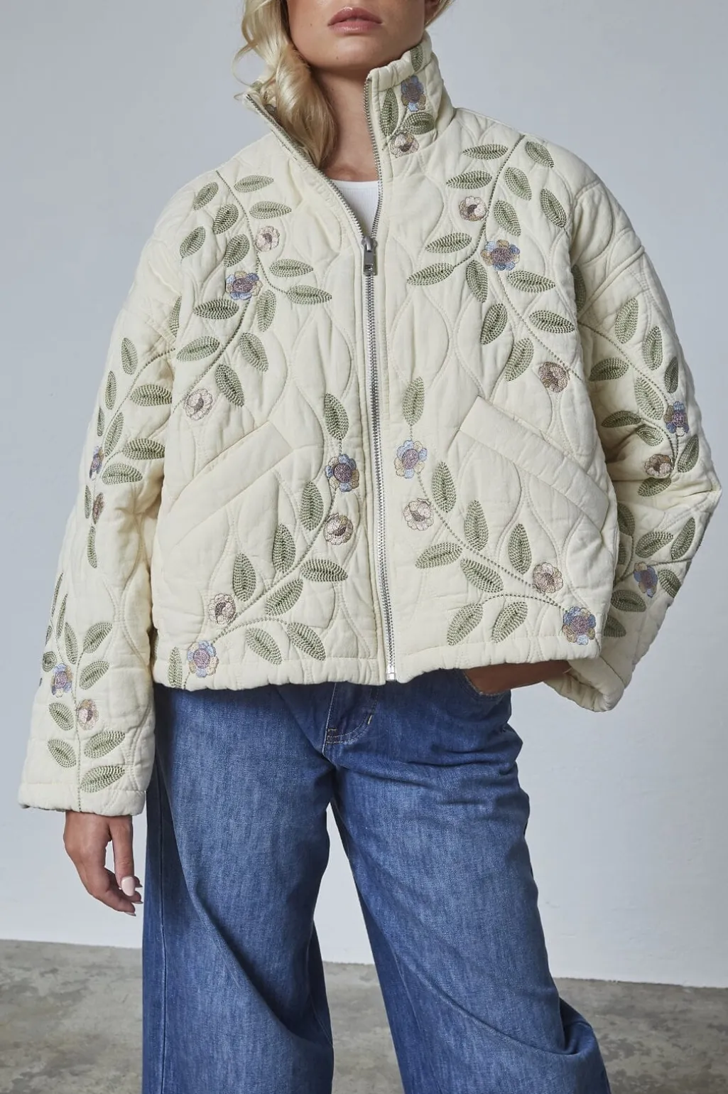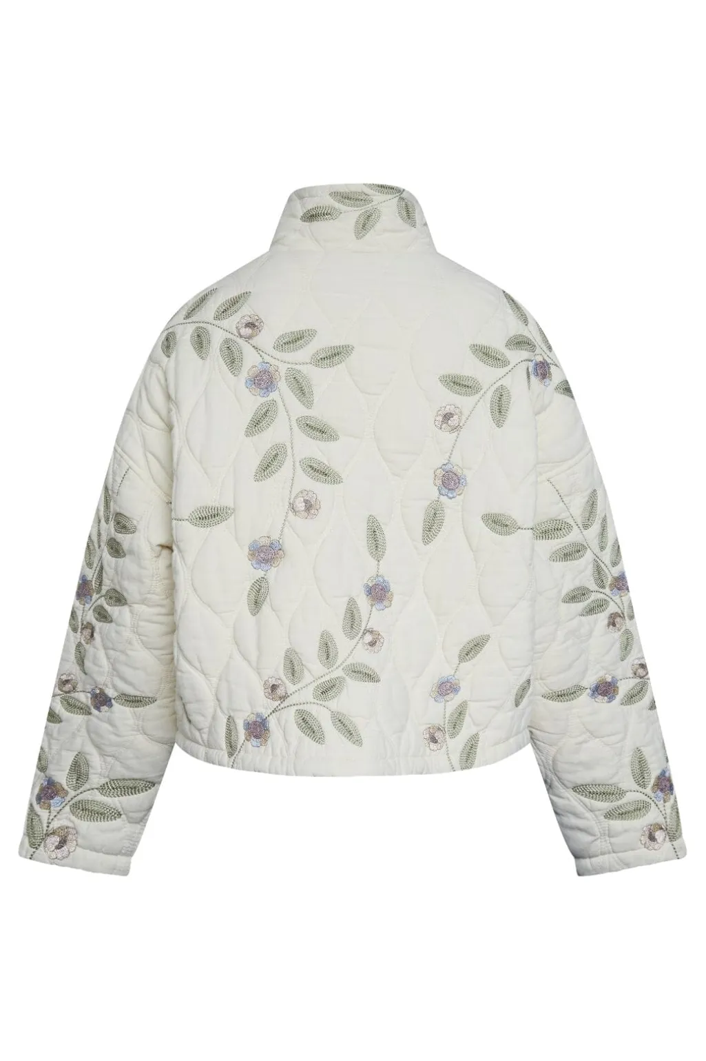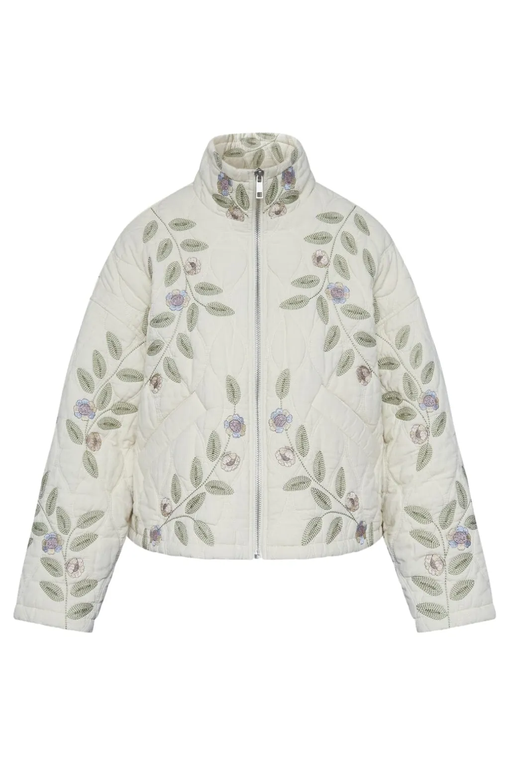 Quiltet jakke fra Love & Divine med broderede blomster på en cremefarvet bund. Jakken har høj krave, lynlåslukning foran og praktiske sidelommer.