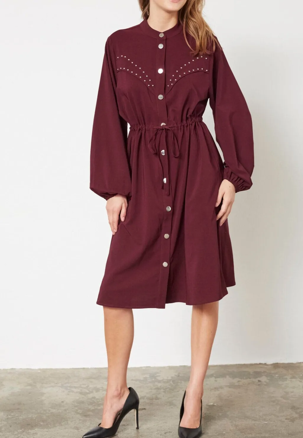 Kjole fra Love & Divine i dyb bordeauxfarve. Kjolen har høj hals, lange ærmer og knælængde med knaplukning foran.