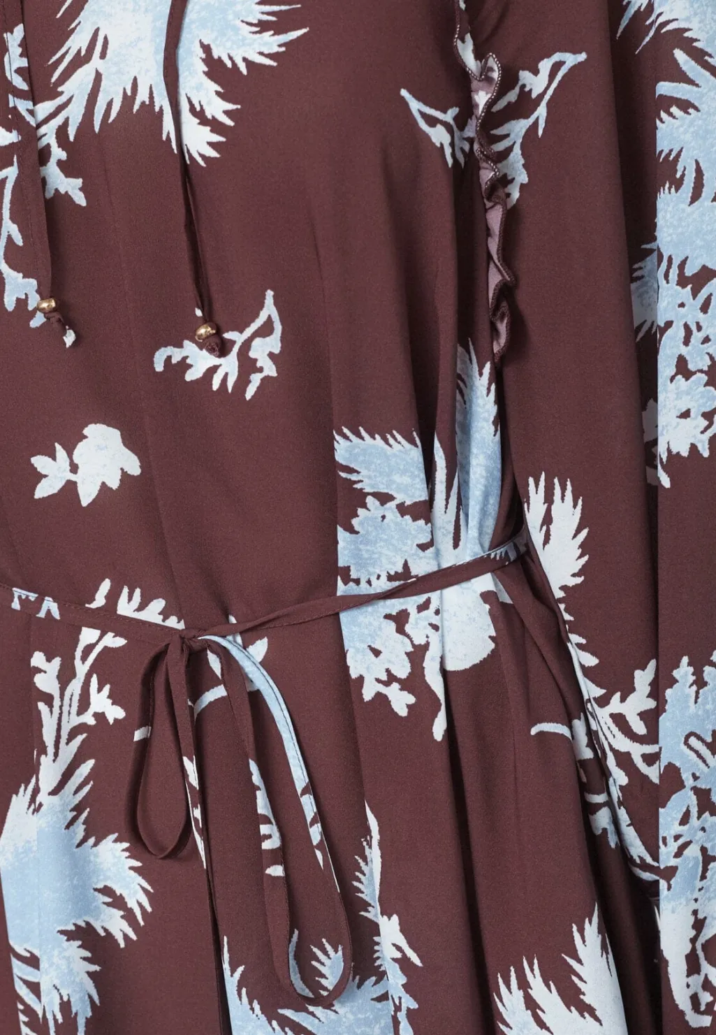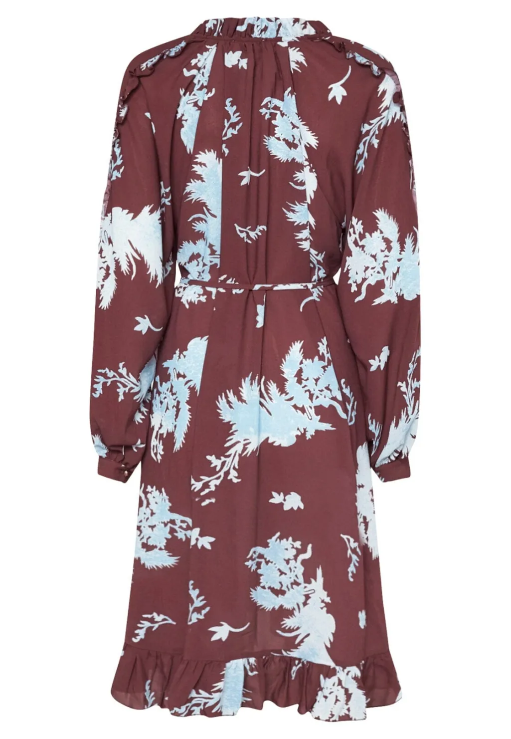 Knælang kjole fra Love & Divine med blomsterprint i bordeaux og lyseblå nuancer. Kjolen har lange ærmer og en løs pasform.