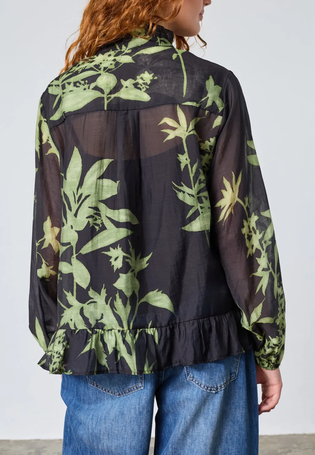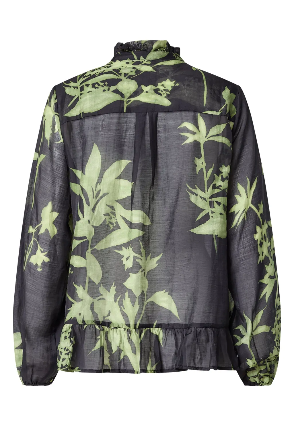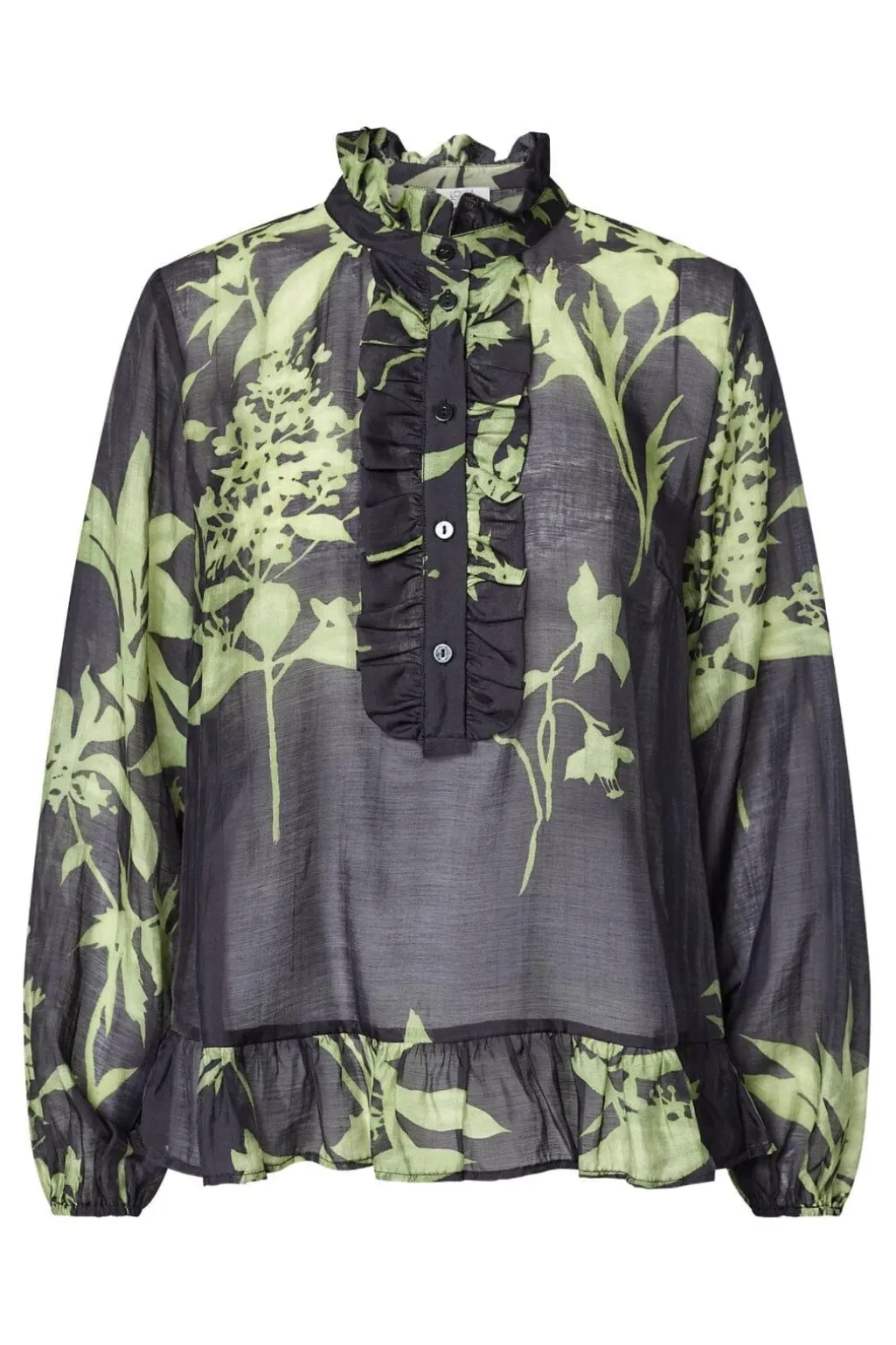 Bluse fra Love & Divine med høj hals og grønt blomsterprint på mørk baggrund. Blusen har flæsedetaljer ved halsen og lange ærmer med rynker.
