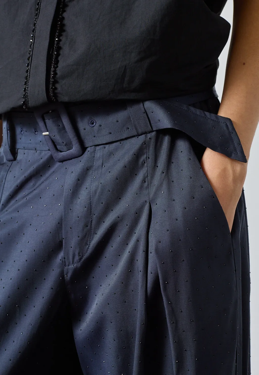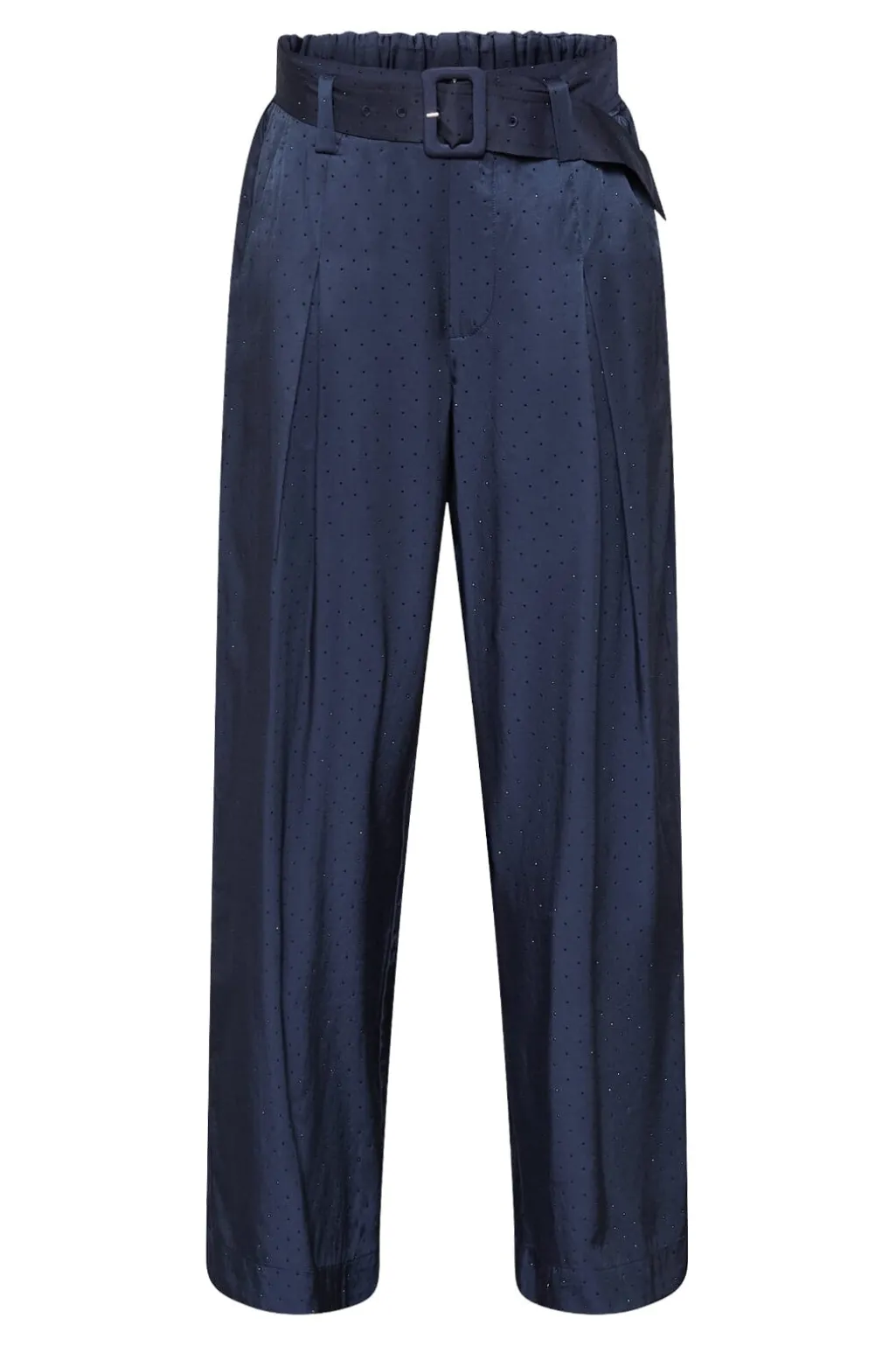 Mørkeblå bukser fra Love & Divine med små prikker og pailletter. Bukserne har høj talje, løs pasform og går til anklen.