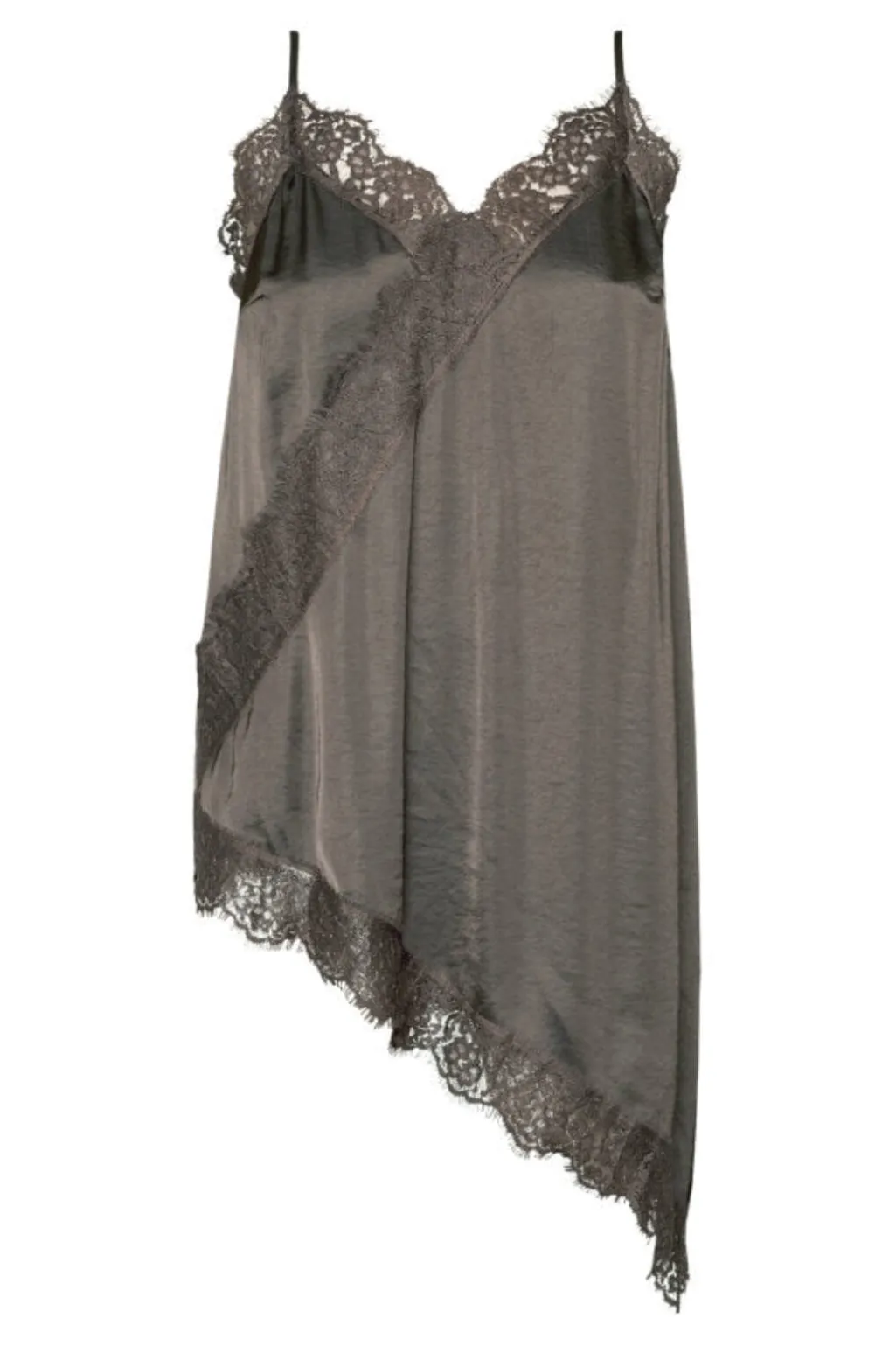 Kjole fra Love & Divine i en dæmpet jordfarve. Lavet af 54 % polyester og 46 % viskose med blondedetaljer og tynde stropper.