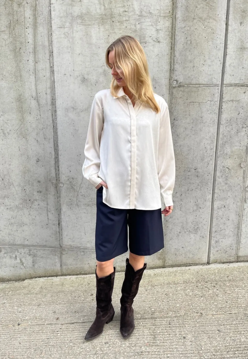 Cremefarvet skjorte fra Love & Divine med klassisk krave og lange ærmer. Skjorten har pailletter langs knaplukningen og manchetter med knapper.