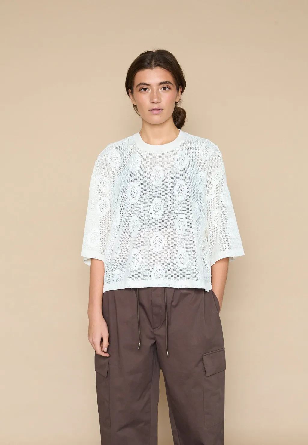 En cremefarvet meshbluse fra Love & Divine med broderede blomsterdetaljer. Blusen har et netmønster med en let gennemsigtig effekt.
