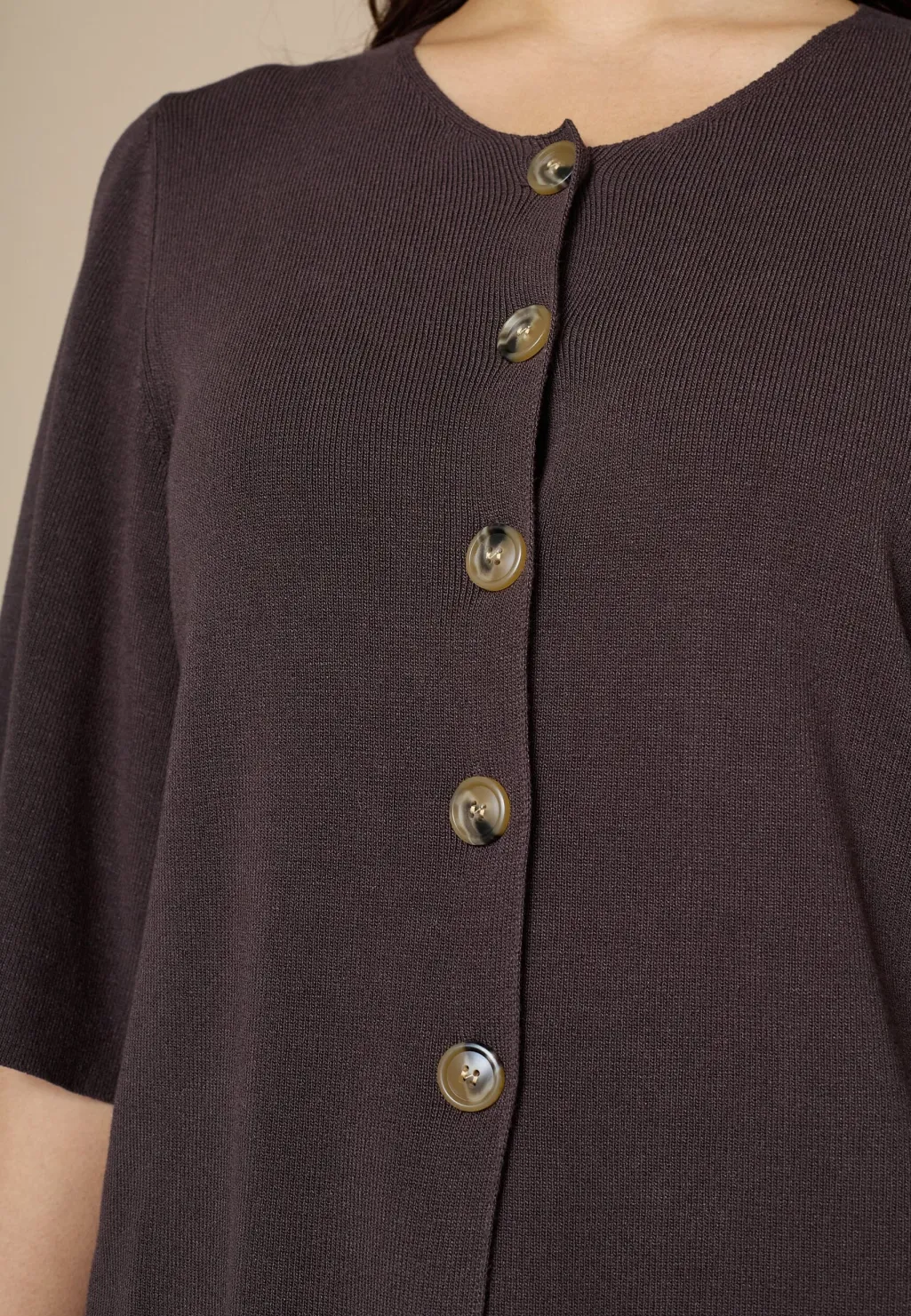 Strikket top fra Love & Divine i en brun nuance. Den har en rund halsudskæring, gennemgående knaplukning og trekvartlange ærmer med klokkeformet snit.