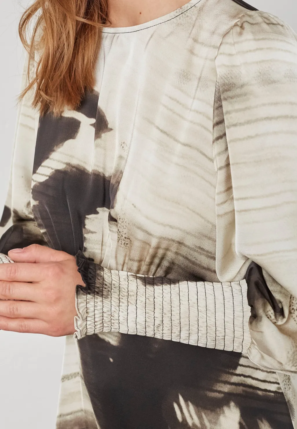 Grafisk kjole fra Love & Divine med et sort-hvidt mønster. Kjolen har lange ærmer, rund halsudskæring og går til midt på læggen.