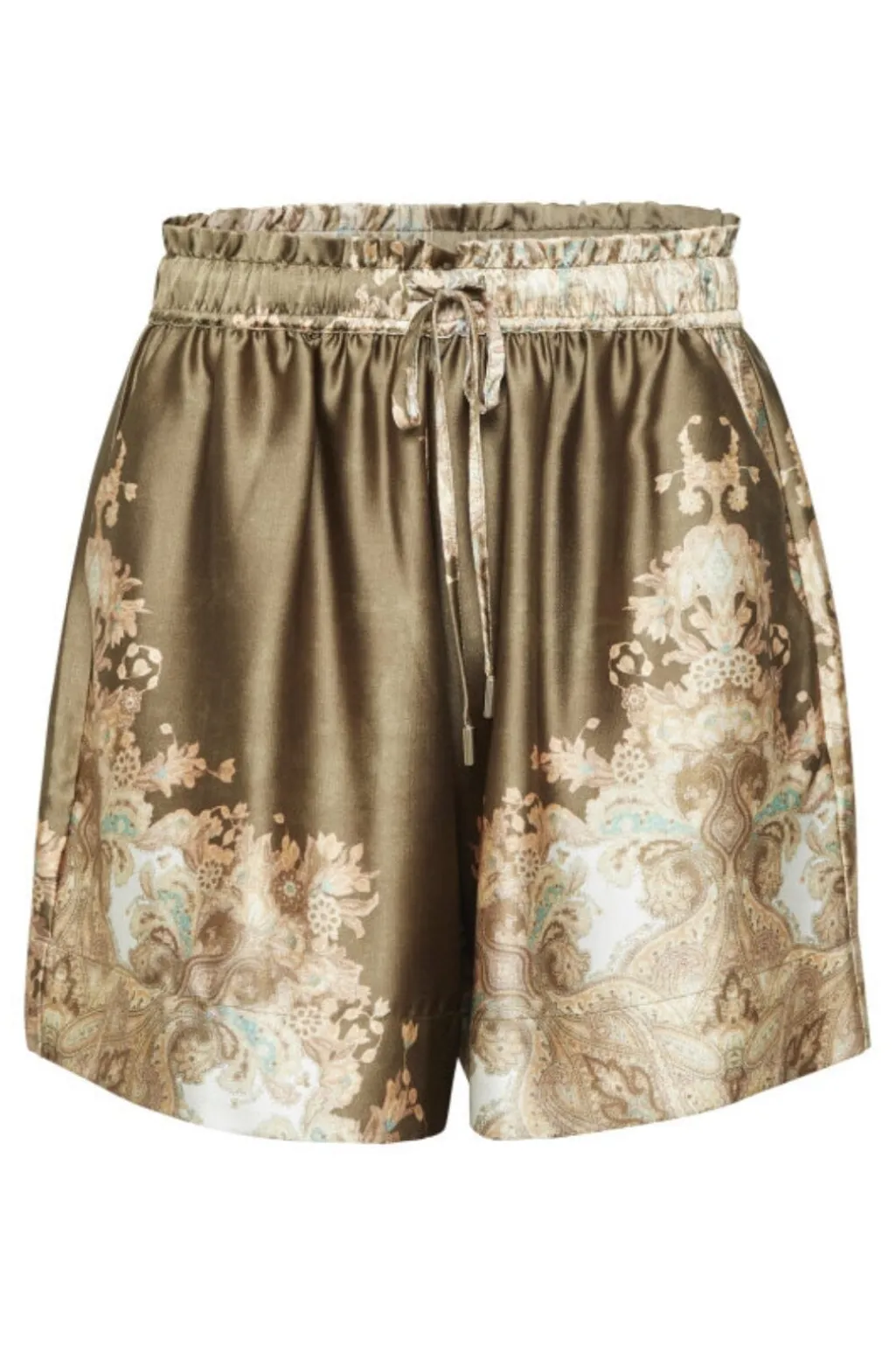 Shorts fra Love & Divine med paisleymønster i khaki grøn. De har en løs pasform og er udstyret med flæser og bindebånd i taljen.
