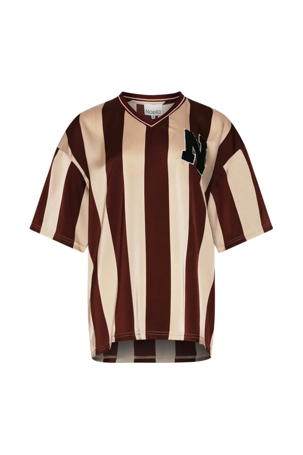 Stribet bluse fra Noella i mørkerøde og cremefarvede striber. Blusen har broderi på brystet og en V-hals.