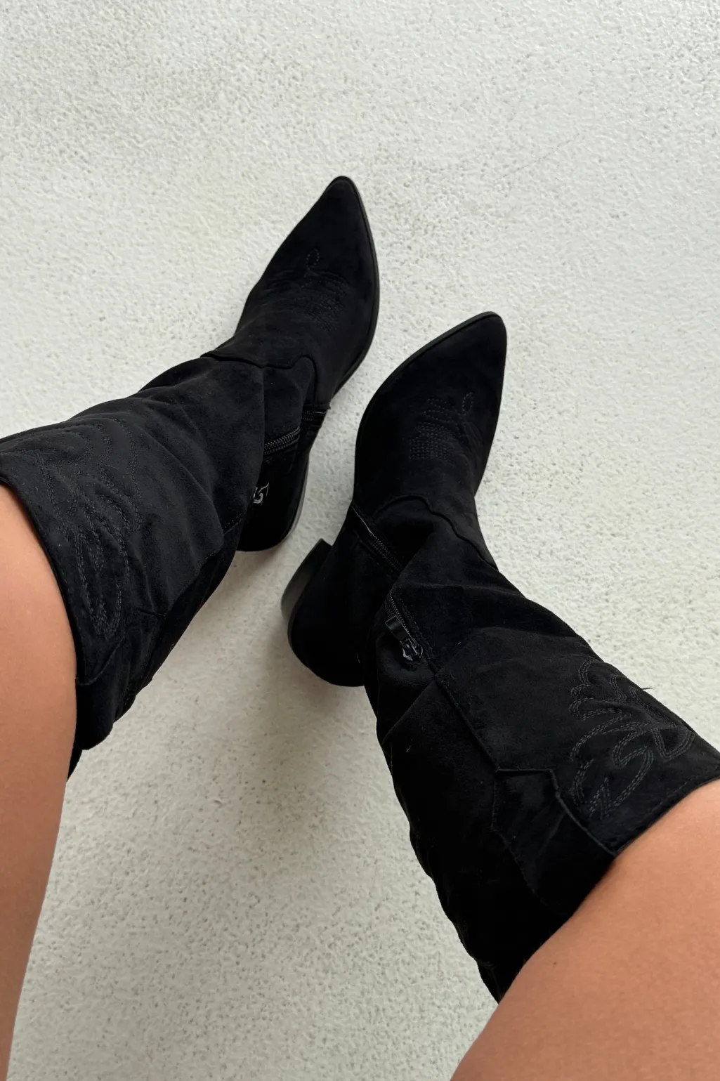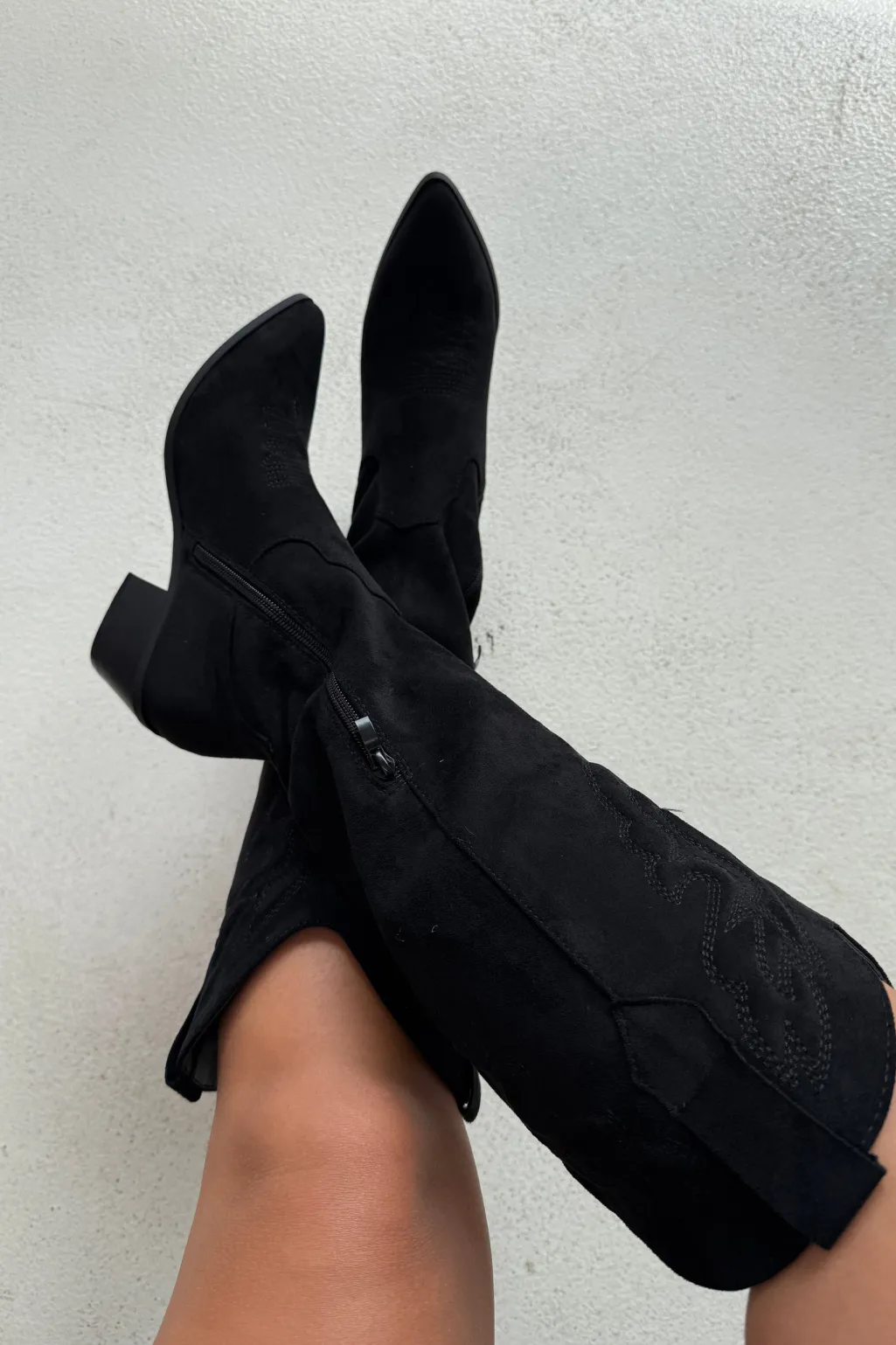 Sort støvle fra Bloom med blokhæl. Støvlen har en hælhøjde på 5-8 cm og en mandelformet snude. Den passer til både hverdag og fest.