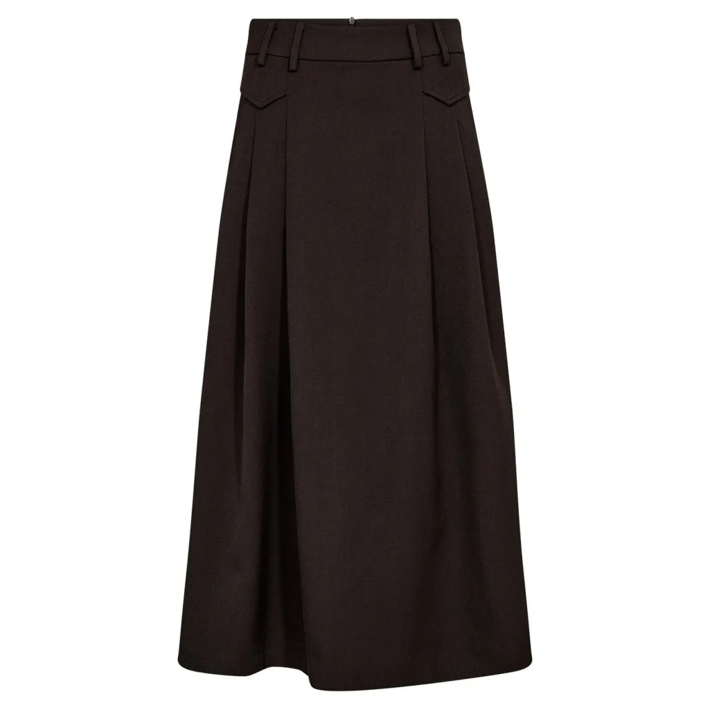 Mørkebrun nederdel fra Co´Couture med læg foran, lommer og bæltestropper i taljen. Nederdelen har en løs pasform og går til midt på læggen.