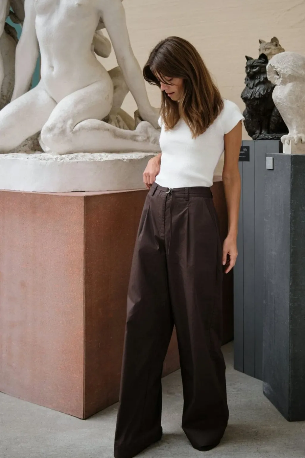 Mørkebrune poplinbukser fra Neo Noir med vid benvidde og pressefolder. Bukserne har en høj talje og går helt ned til gulvet.