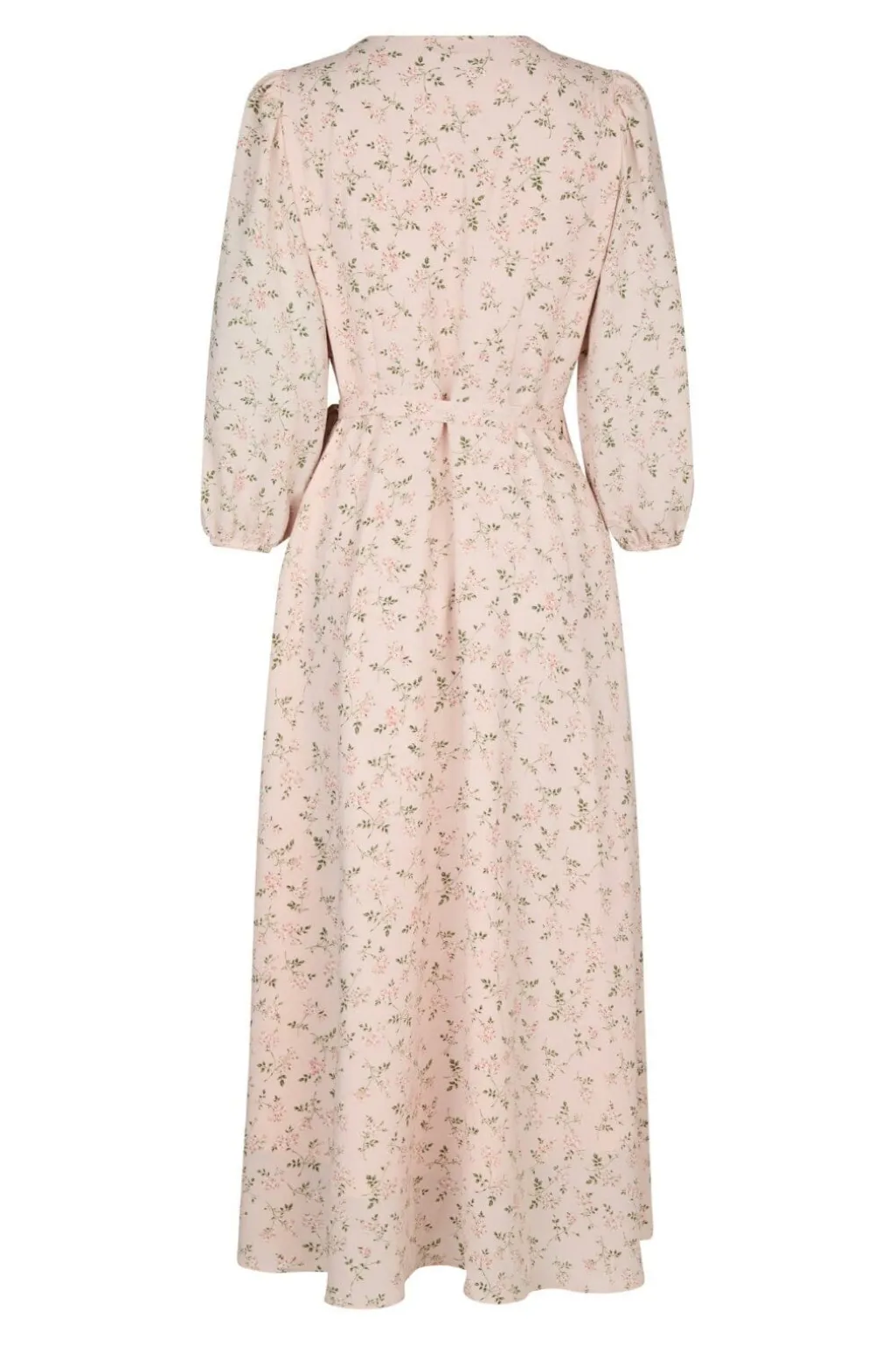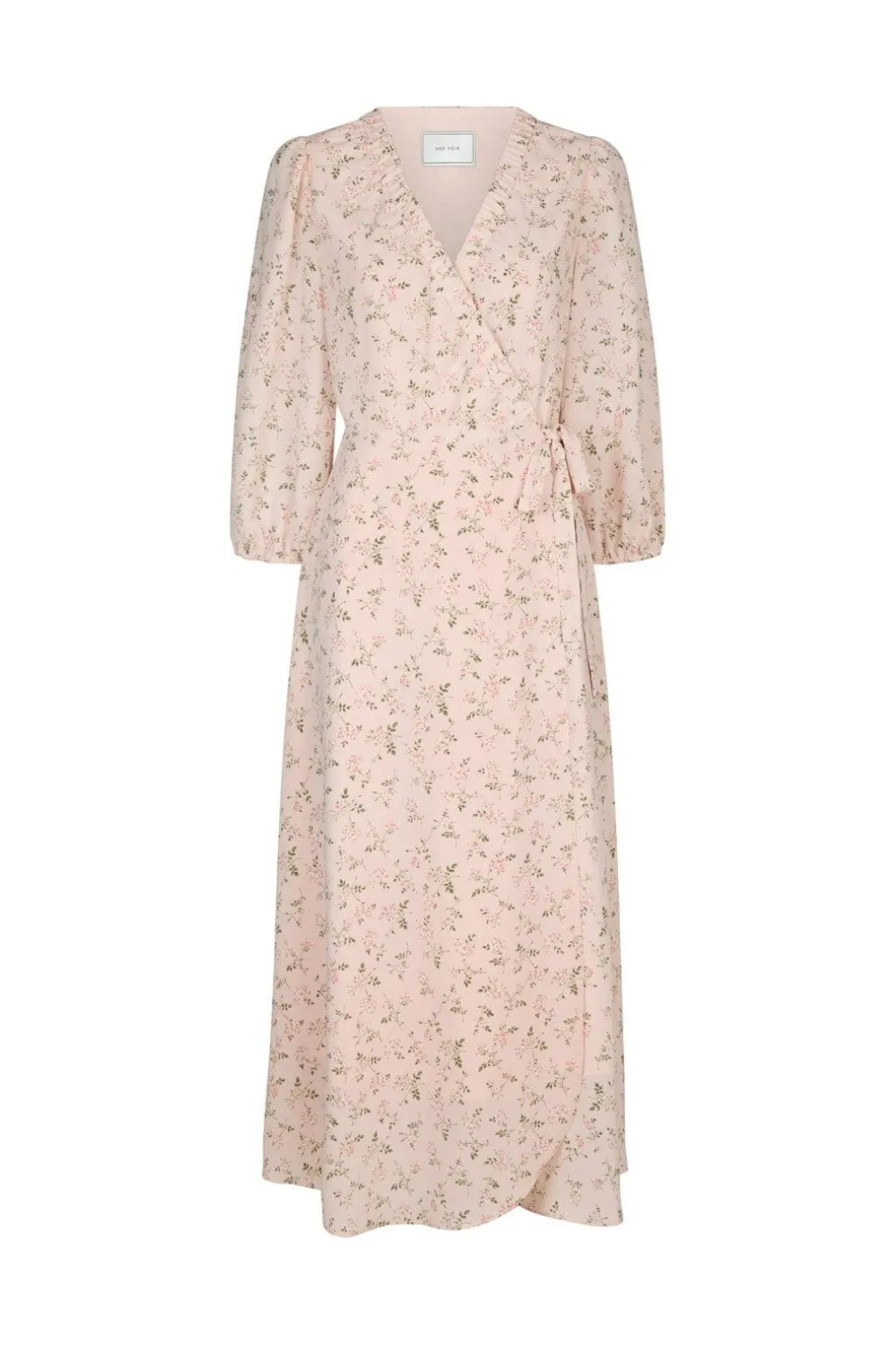 Lyserød slå-om-kjole fra Neo Noir med blomsterprint. Kjolen har en kalvelang model med 3/4 pufærmer og V-udskæring med elastik, der skaber et draperet look.