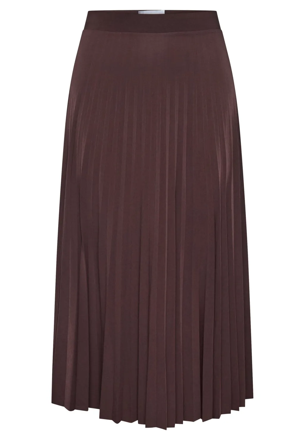 Plisseret nederdel fra Sisters Point i chokoladebrun. Nederdelen har en høj talje og en lang længde, der går under knæene.
