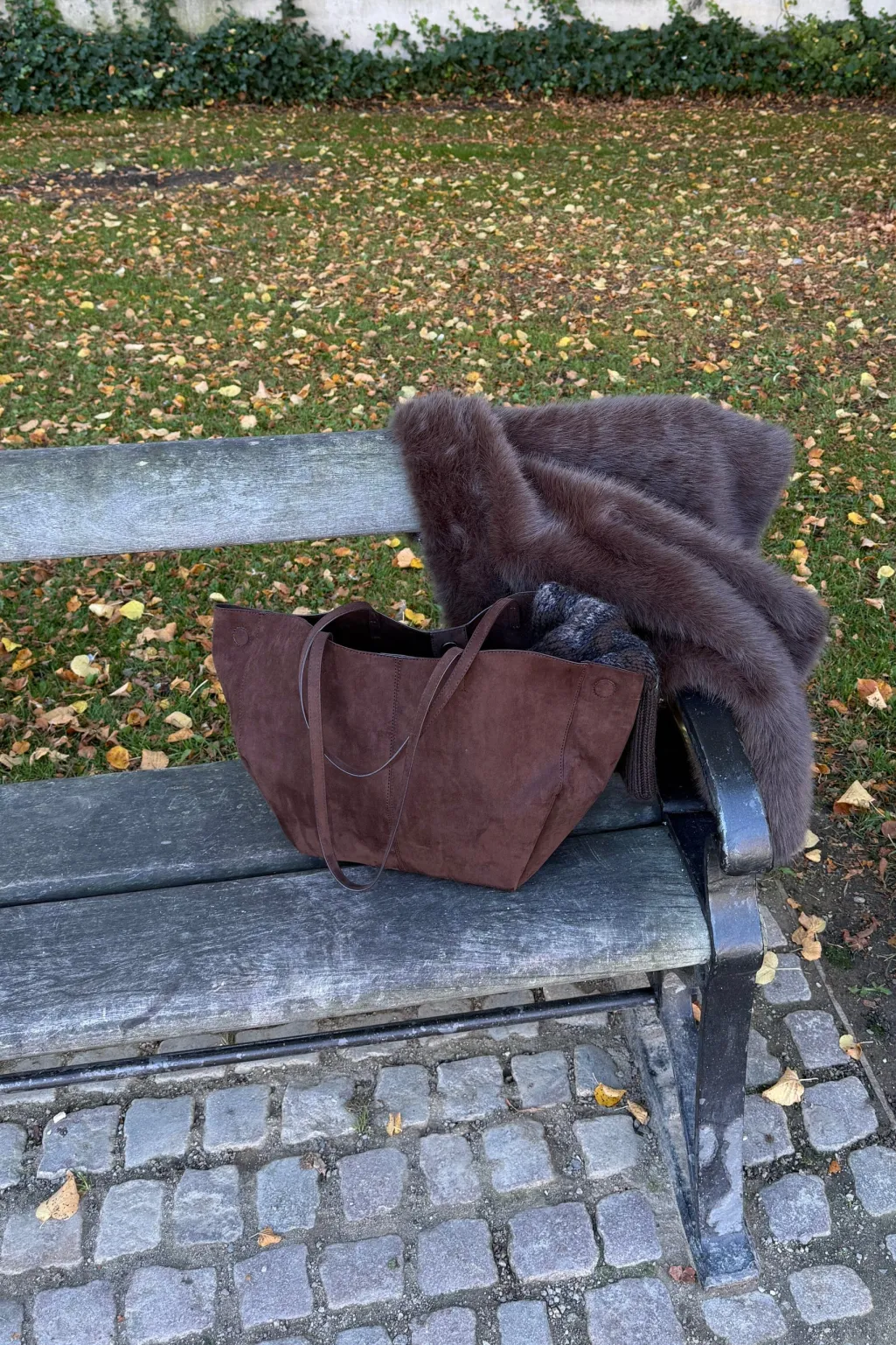Stor taske fra Noella i kaffebrun med ruskindslignende overflade. Tasken har lange hanke til skulderen og en rummelig inderside med plads til både computer og hverdagens nødvendigheder.